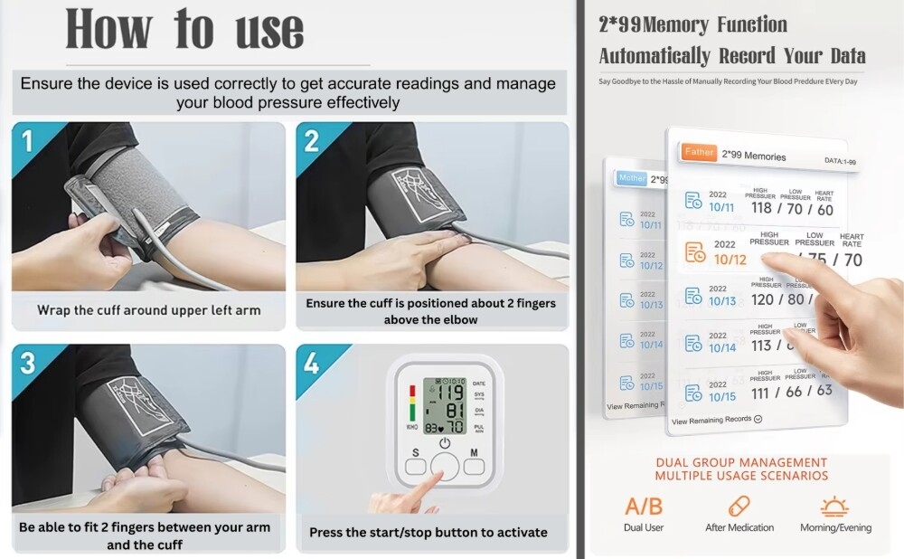 Stores 2×120 readings with date/time stamps for two users, enabling accurate health trend monitoring for couples and families.