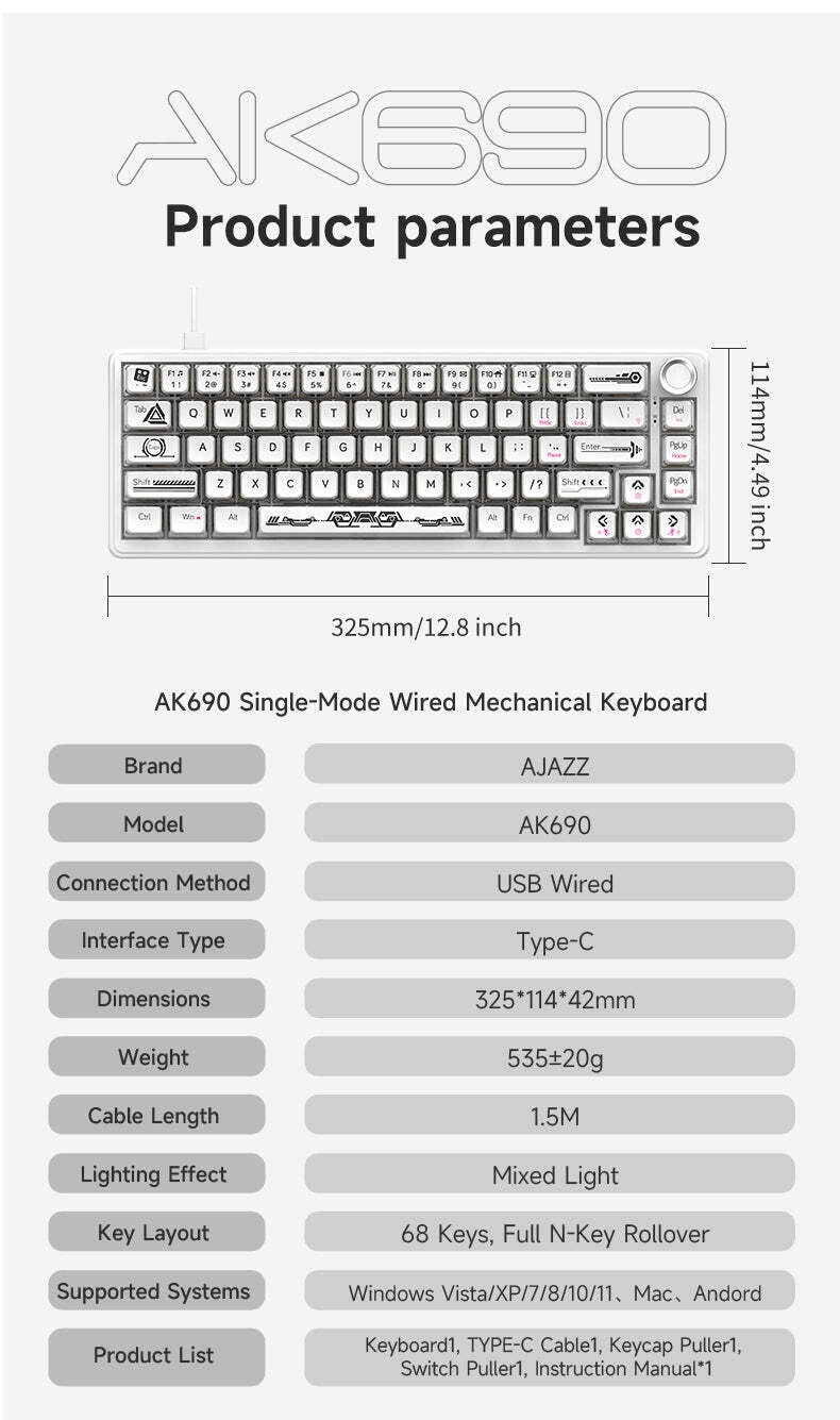 Ajazz AK690 Mechanical Keyboard, Full Hot-Swappable Keys, Multi-Function Metal Knob, wired 68KeysKSh 5,510KSh 8,80037%Add to cart