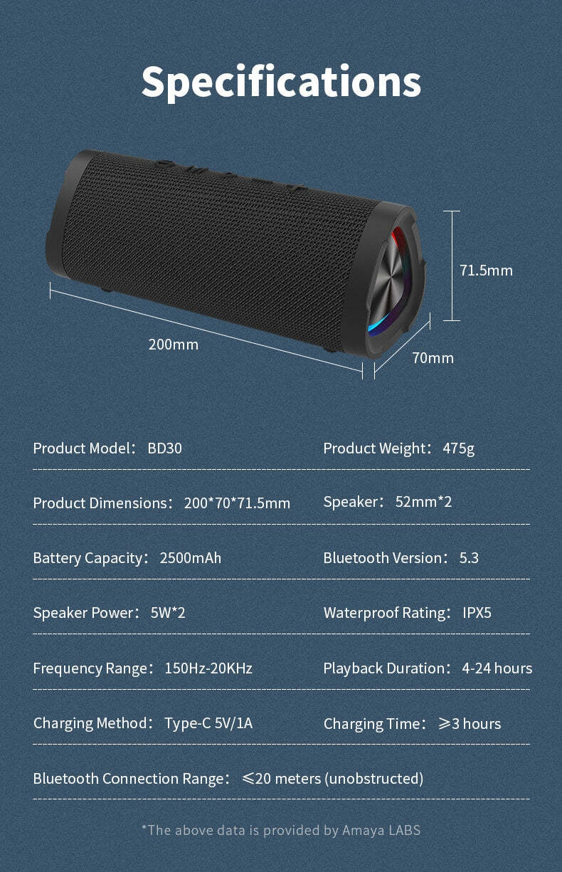 The Amaya BD30 is IPX5 waterproof, which means that it can withstand splashes of water from any direction. This makes it the perfect speaker for use outdoors or in humid environments.