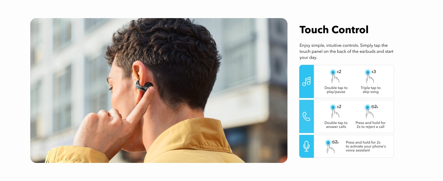 Key FeaturesEnjoy Up to 30H PlaytimeOpen-Ear EarbudsClip-On HeadphonesLightweight ComfortStable FitFirm-Shell DesignIPX4 Water-ResistantBig Drivers for Clear Audio