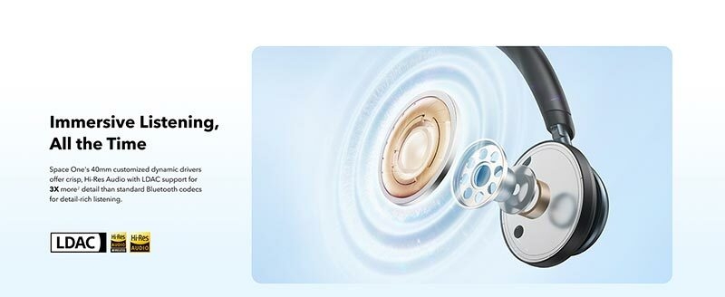 • Journey with Hi-Res Audio: Space One’s 40mm customized dynamic drivers support LDAC for Hi-Res Wireless audio, delivering 3X more detail than standard Bluetooth codecs for detail-rich listening without any tangled wires.