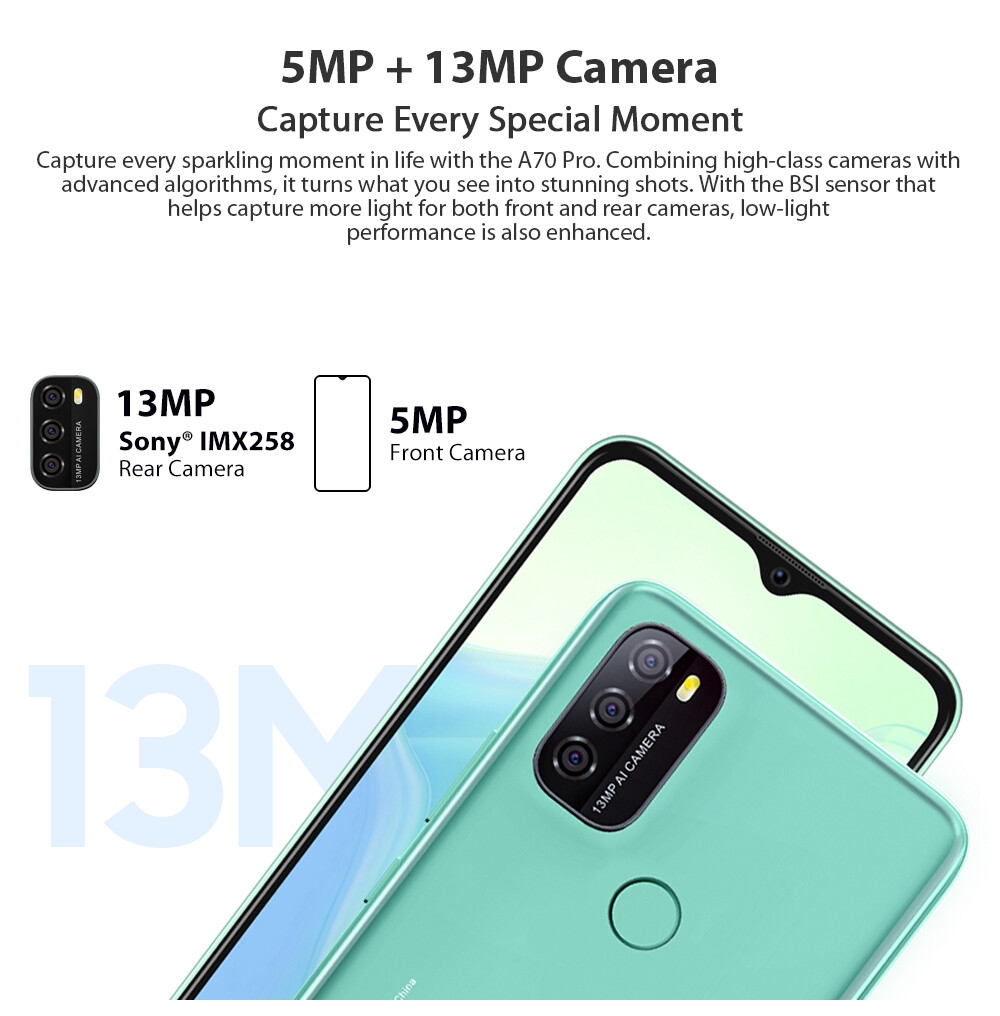 Capture every sparking moment in life with the A70Pro. Combining high-class cameras with advanced algorithms, it turns what you see into stunning shots. With the BSI sensor that helps capture more light for both front and rear cameras, low-light performance is also enhanced.