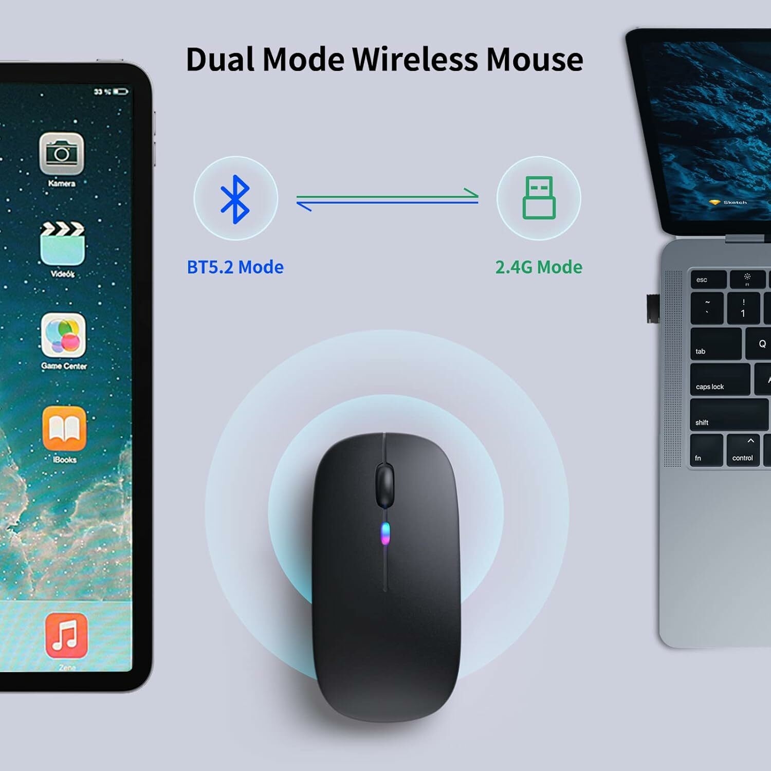 Key FeaturesBluetooth + 2.4G Dual-mode Wireless LED Mouse Brand Agapeon 2.4G stable transmission, Plug and Play, 10m connection distanceMicrore rechargeable interface, no longer pay for batteriesSilent click, no longer interrupt othersColorful breathing LED light (can be turned off) the control button at the bottom of the mouseSensitivity up to 1600 DPI, switch: 800DPI / 1200DPI / 1600DPI4 buttons with scroll wheel, suitable for high-precision optical systems of Smart TV Score desktop Android boxUltra-precise scroll wheelOptical technology works on most surfaces and all mouse padsErgonomic design, several hours of use without fatigue