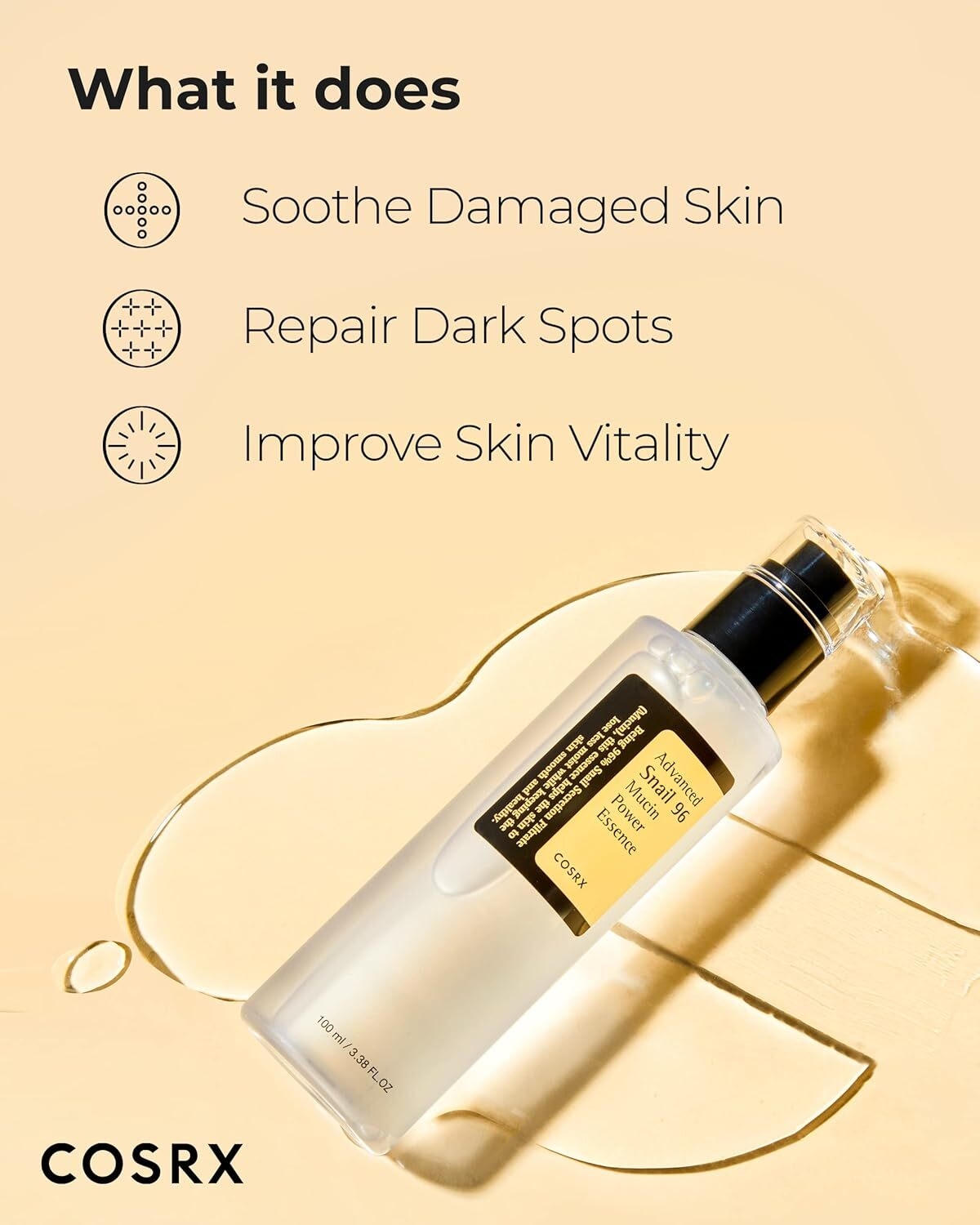 Formulated with 96% Snail Secretion Filtrate(Mucin), this essence protects the skin from moisture loss while keeping the skin texture smooth and healthy. This essence is created from nutritious, low-stimulation filtered snail mucin in order to keep your skin moisturized all day while bringing back your skin's vitality. The filtered snail mucin replenishes and revitalizes nutrients with looking healthy skin. It's suitable for all skin types. For best results, use together with Advanced Snail 92 A