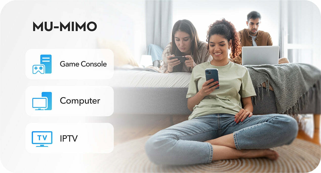 MU-MIMO technology allows more devices to connect simultaneously with reduced latency, ensuring fast, seamless internet for all devices.