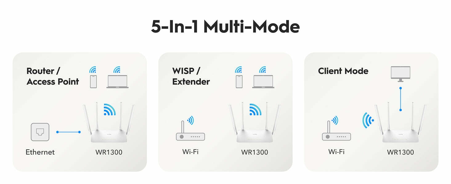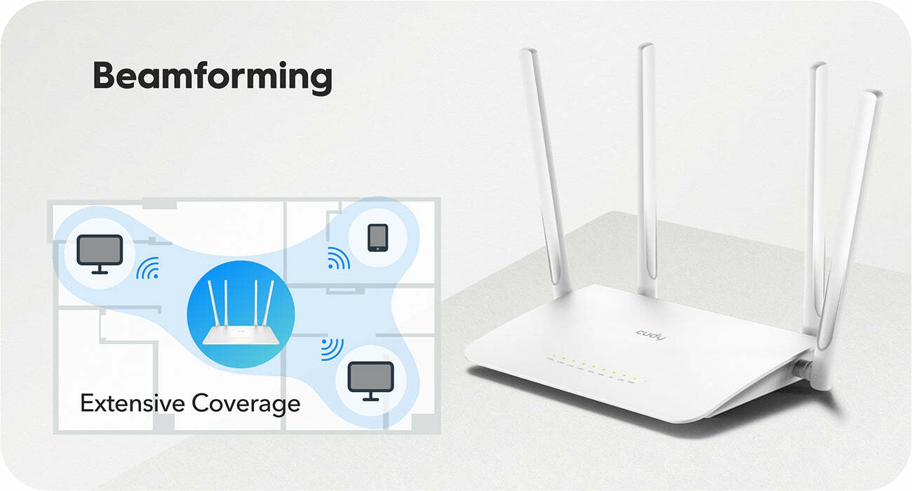 A dual-band AC1200 WiFi router ideal for smooth 4K playback, gaming, a connecting to a max 1000 Mbps internet access, featuring Cudy Mesh, app control, VPN, and MU-MIMO.