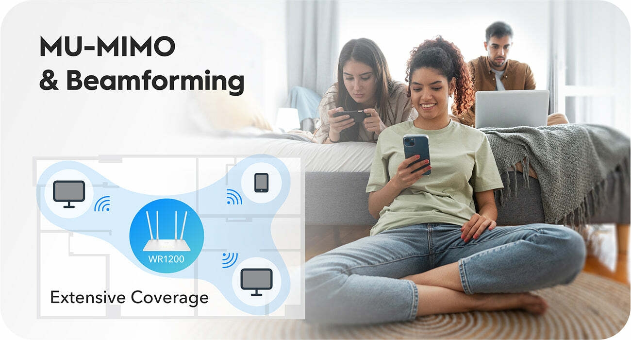 A dual-band WiFi router ideal for streaming smooth video playback with a maximum of 100 Mbps internet access, featuring MU-MIMO and App control.