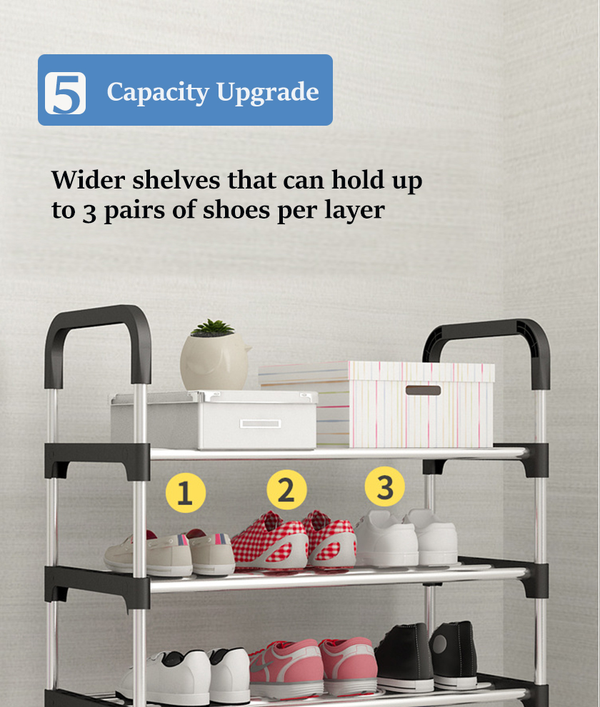 This space-saving, multi-tier shoe rack is a simple, modern, and economical solution for organizing shoes at the entryway. Designed for easy assembly, it fits neatly at the door, making it ideal for home use, dormitories, or small spaces. With multiple tiers, it offers ample storage capacity while maintaining a compact, minimalistic design that complements various interior styles. The rack is durable, practical, and perfect for keeping shoes neatly organized and accessible.