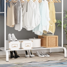 | Double pole Double pole gament rack, double storage space | Non-slip foot pad The non-slip foot pad design makes it difficult to move whether it is in the room or the bathroom. | Single layer shoe rack There is an additional shelf at the bottom of the garment rack, where shoes, shoe boxes, storage baskets, etc. can be placed. | Anti-slip beads There are anti-skid beads on both sides of each shelf to prevent clothing from falling. |
