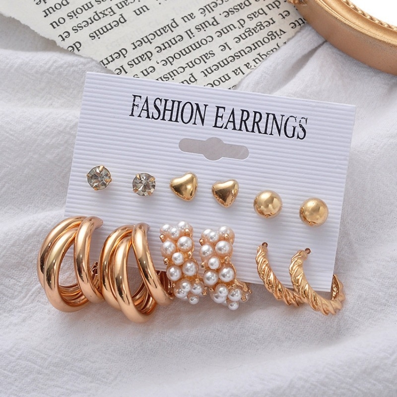 Fashionable Women's Exquisite Dangle Earrings and Studs Set, Gold Color Vintage Geometry Pearl Earrings Set - 6 Pairs Description: Crafted from alloy, this earring set is durable and resistant to fading. Exuding a simple elegance, the earrings' unique hoop and heart design add a touch of class to any look, highlighting your fashion sense and showcasing your unique and elegant personal charm. Suitable for any skin type, they meet your everyday needs. This exquisite earring set includes six pairs of earrings in various sizes. They can be worn stacked or worn casually. They complement any outfit, showcasing your unique and elegant personality and charm. They complement any outfit, adding sparkle and individuality. For women and fashion enthusiasts, this earring set embodies individuality and taste, perfect for those who value unique accessories. This exquisite earring set makes a wonderful gift. Not only a beautiful accessory for a party, it also makes a wonderful Christmas, New Year's, birthday, or Mother's Day gift for friends or family.