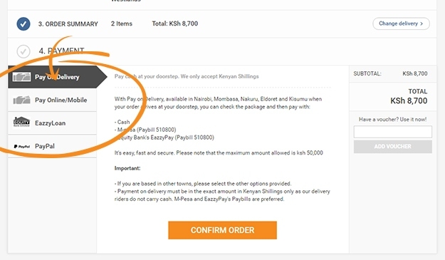 During the payment step, you can choose between "Pay on Delivery" and "Visa/Verve/Mastercard" from the menu on the left to either proceed with pay on delivery or pay with credit card.
