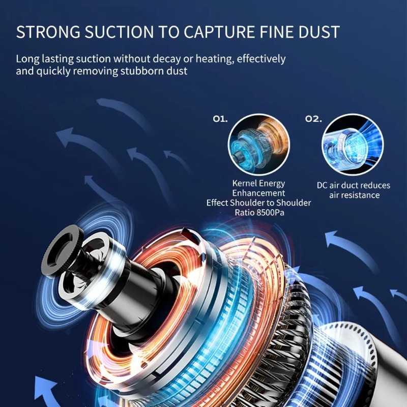 Powerful Suction: Our handheld cordless vacuum cleaner boasts a powerful 8500Pa suction force, capturing even the finest dust and dirt particles.