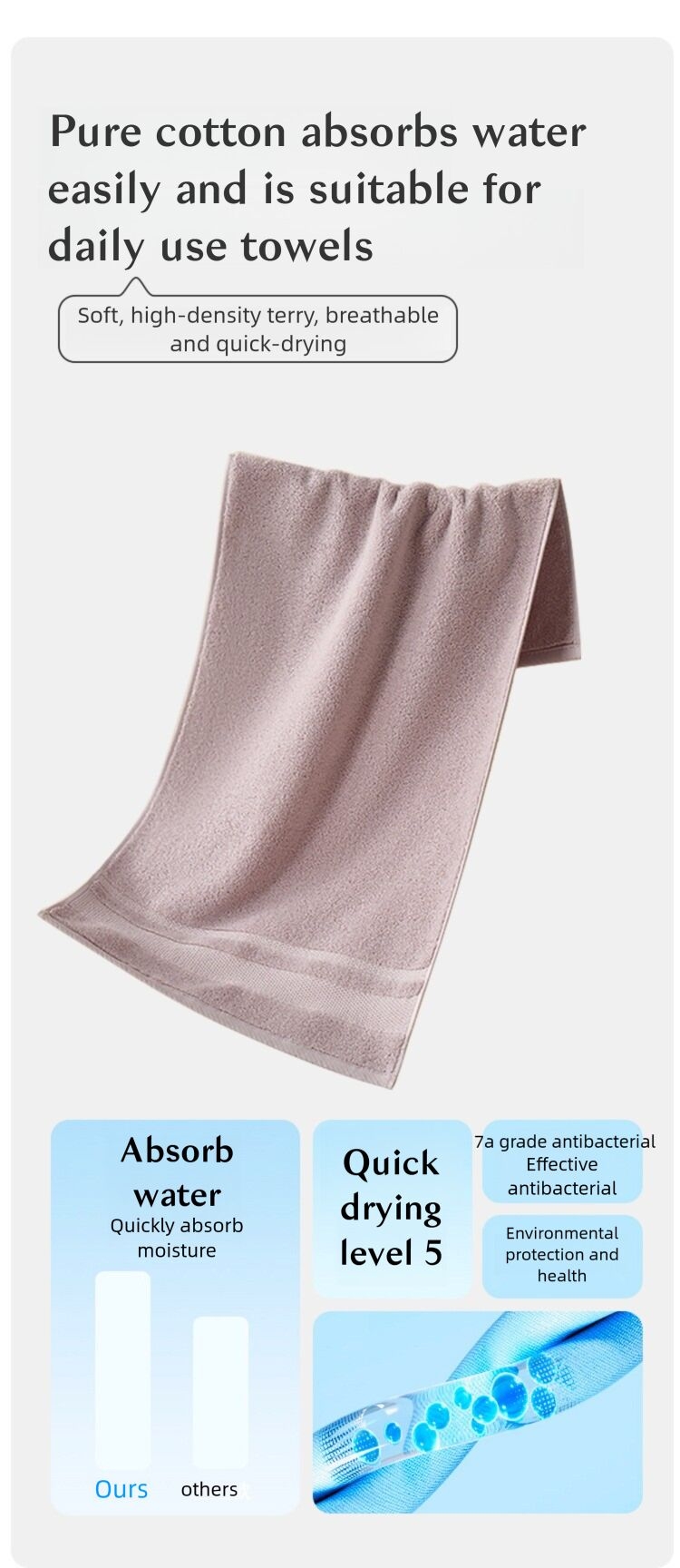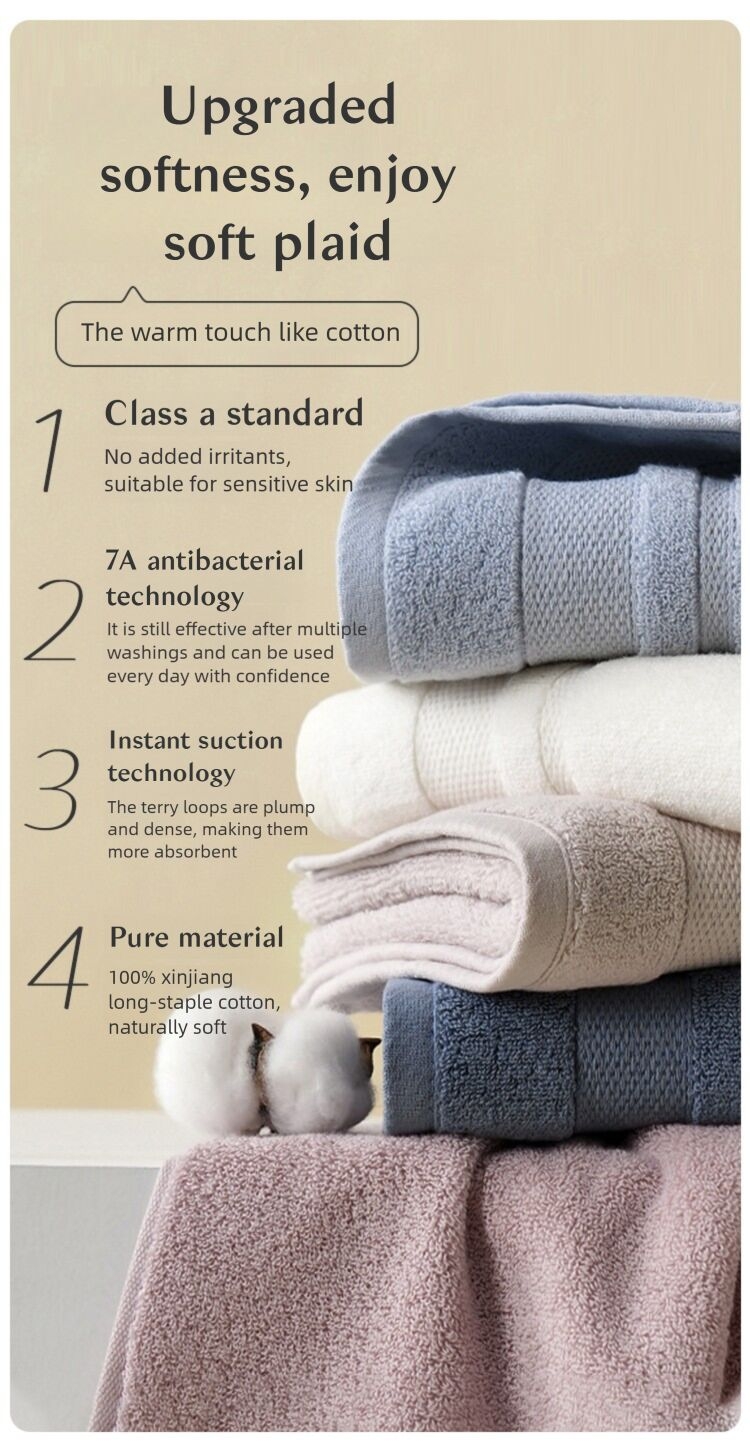 Product Features: 【3-Pack Antimicrobial Xinjiang Cotton Towels】Crafted with 7A-grade Xinjiang cotton for exceptional softness and skin-friendly comfort. Advanced antibacterial technology effectively inhibits bacterial growth, while the thickened design ensures rapid absorption and quick drying. This set includes white, pink, and blue towels that remain fresh and fluffy after washing. Ideal for daily use with no lingering odors—perfect for a reliable and luxurious experience. Product Attributes: Material: Pure cotton