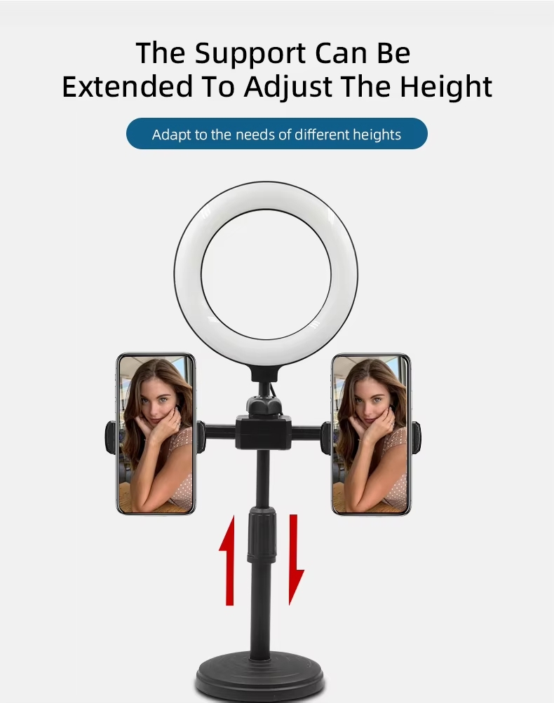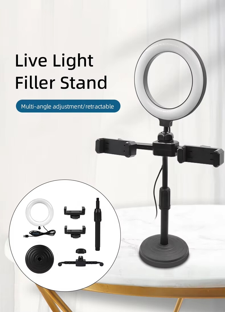 【Ring Light】: The 6" ring light uses USB Power Supply. Brightness and color temperature adjustable. Three-stage of color tempuratures(3200k-6500k): Cool/Nature/Warm. For each color temperature you can change the brightness as you need.