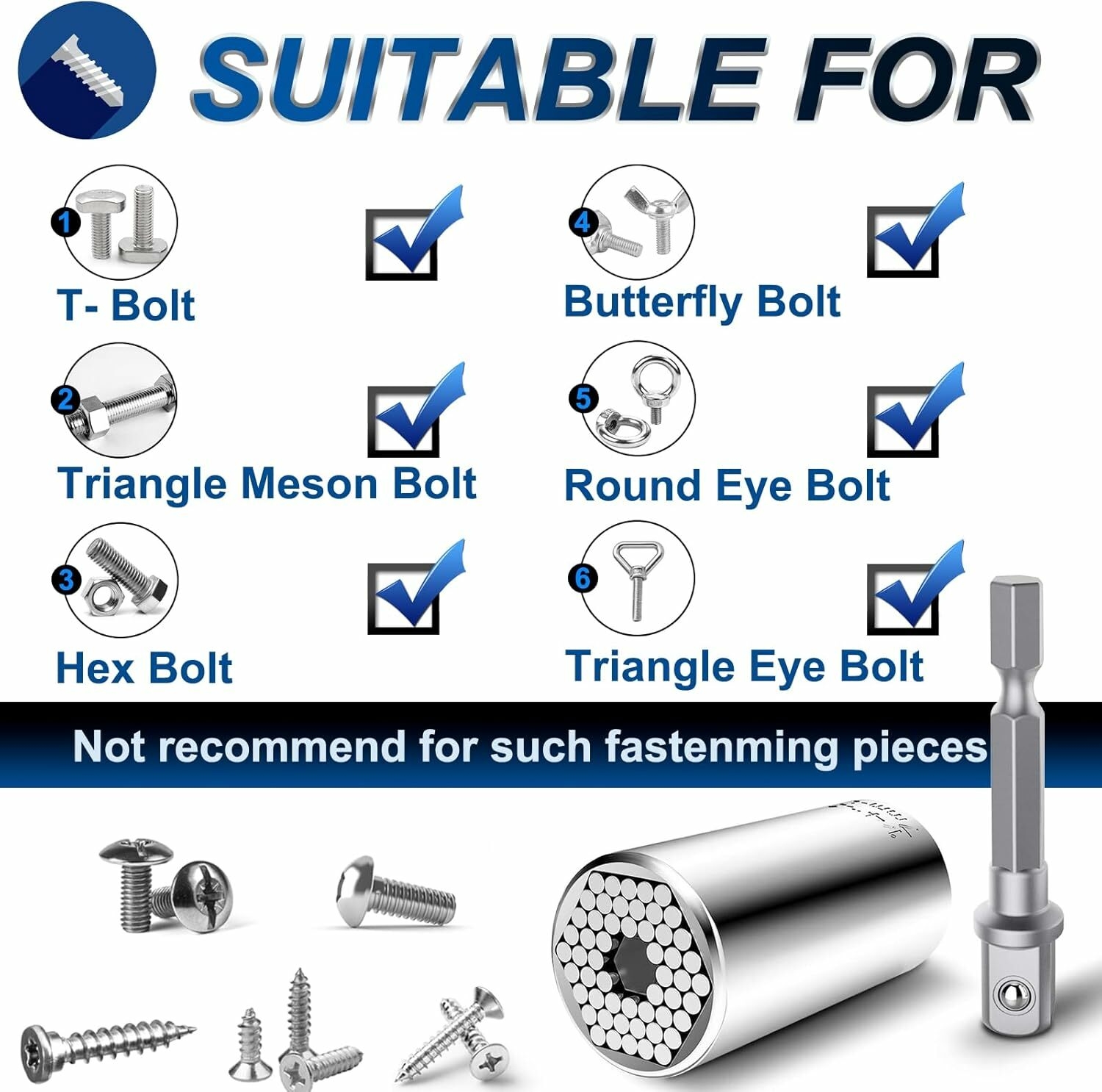 Quick and easy to disassembly and assembly all kinds of screws, hooks, lag screws, and bolt heads etc. Self-adjusts to fit thousands of fasteners.