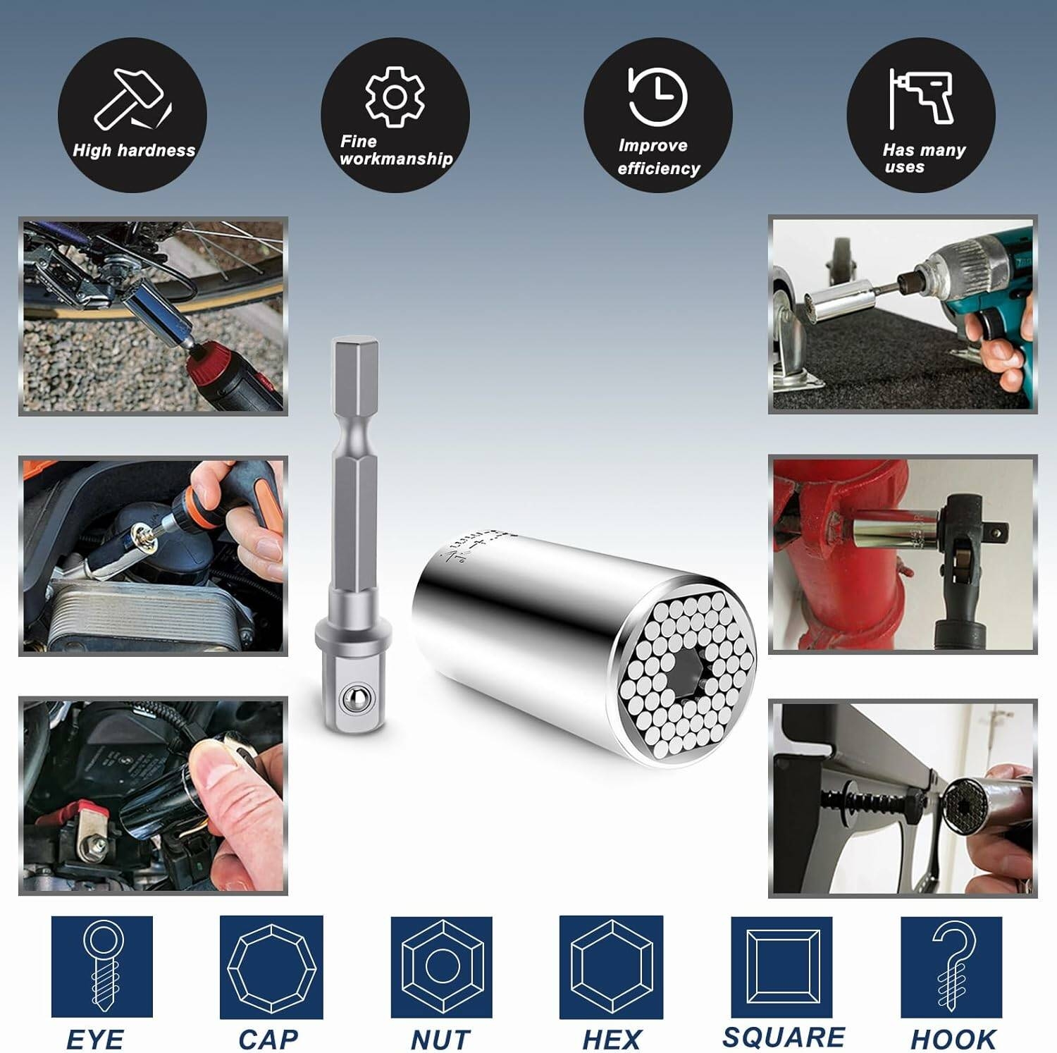PROFESSIONAL: The universal socket fits 7-19mm(1/4 to 3/4'') nut, bolt, and most irregular shape. This universal socket repairing tool can be used in the automotive industry, household maintenance, manufacturing industry, construction.