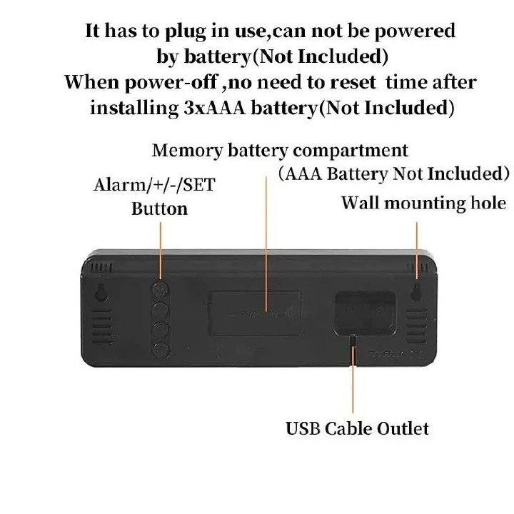 2xAAA battery(Not Included) only for Power-off memory,no need to set time again if Power cut