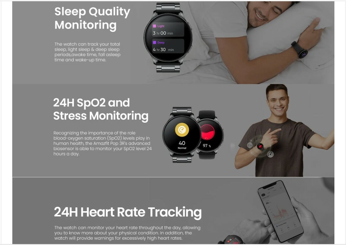 24H Heart Rate, SpO2 & Stress Monitoring: The watch can monitor your heart rate, blood-oxygen and stress level all day, allowing you to know more about your physical condition. In addition, the watch will provide warnings for excessively high heart rates. The watch can track your total sleep, light sleep & deep sleep periods, awake time, fall asleep time and wake-up time.