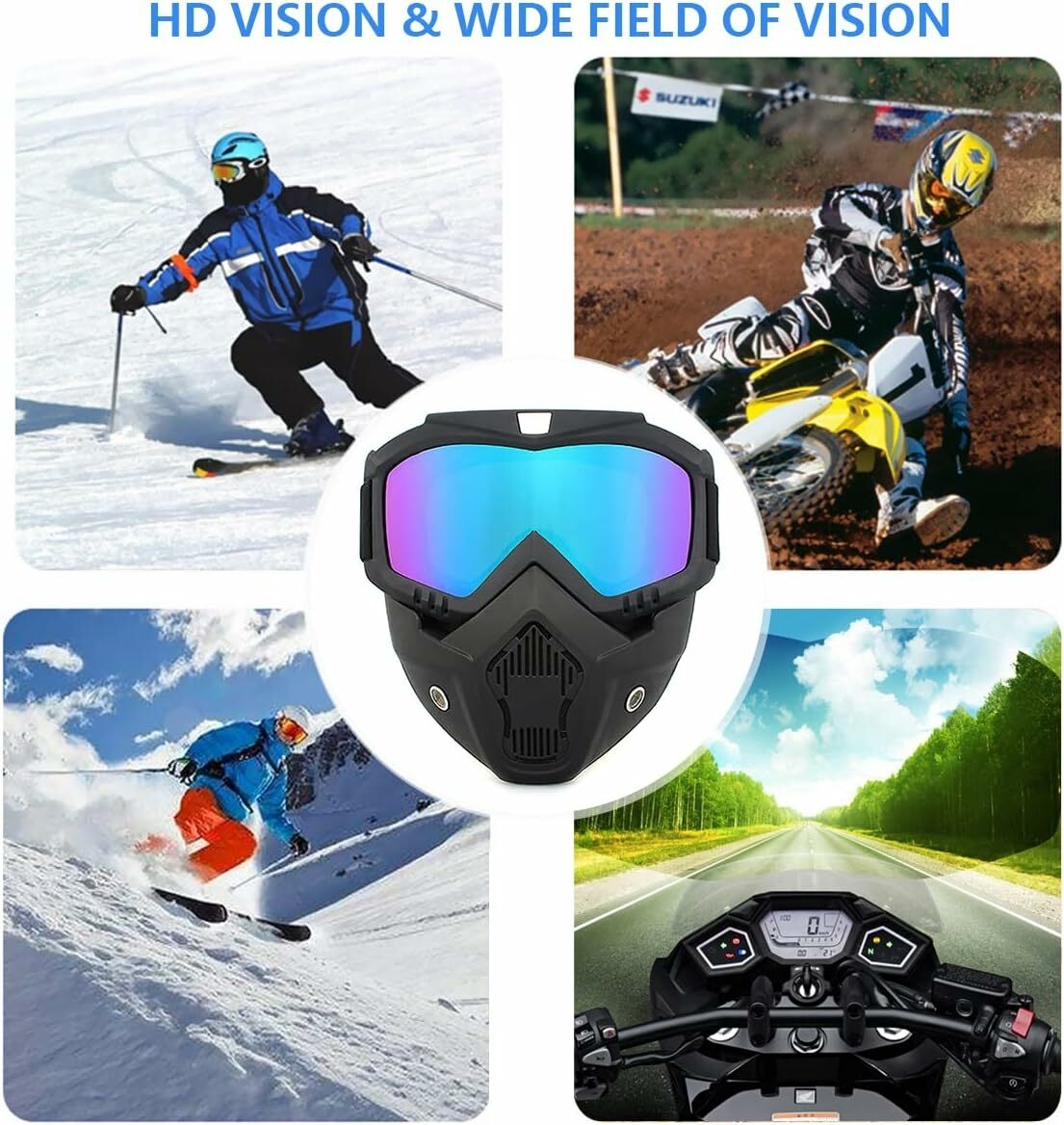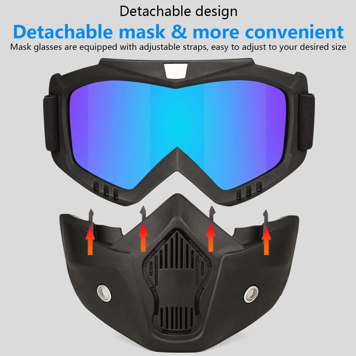 【Product function】Motorcycle glasses can be tightly attached to your face, better windproof, waterproof, dustproof, UV-proof, and even help avoid fogging. Motorcycle glasses are designed to be detachable. Therefore, the glasses can be used individually as needed.