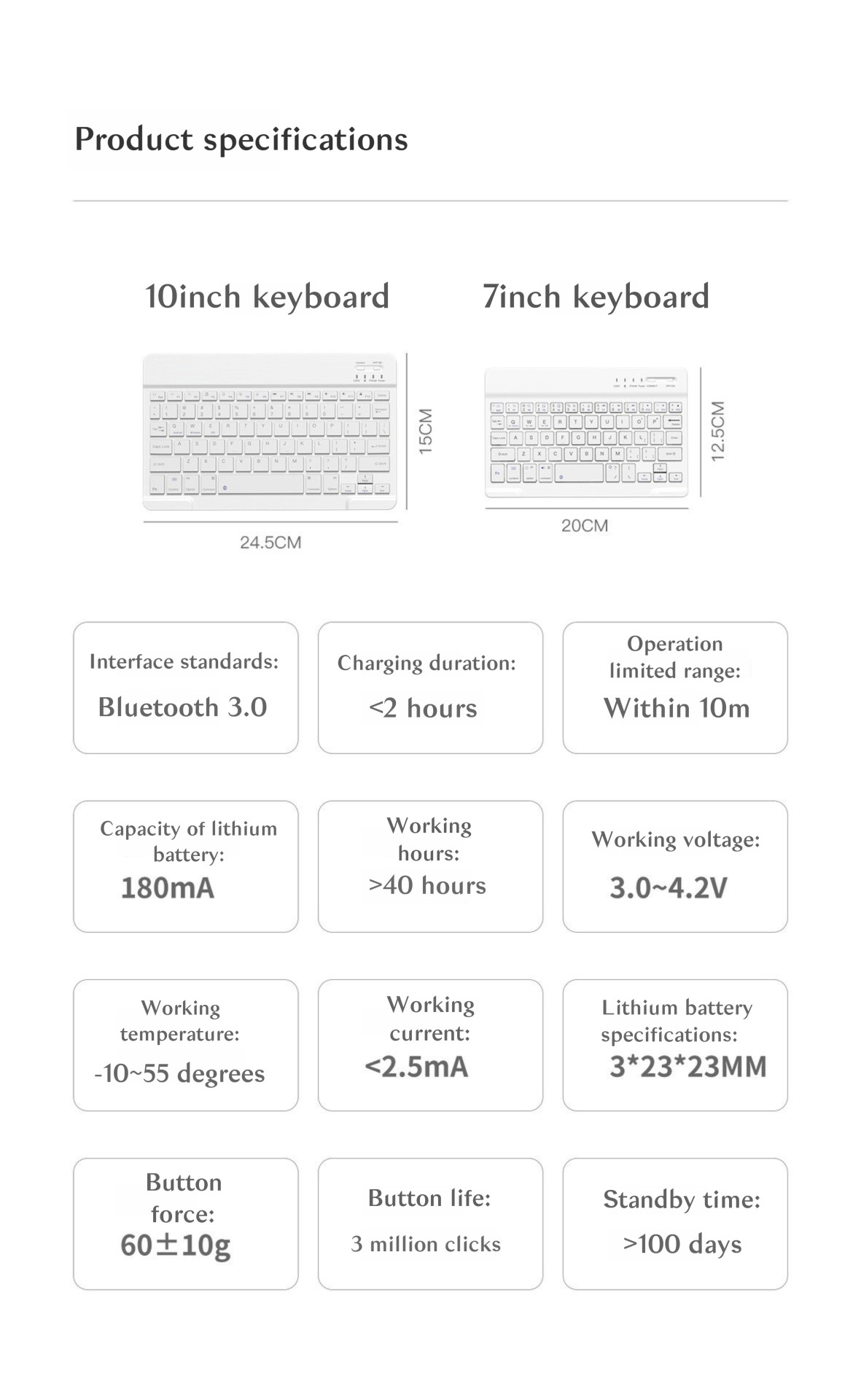Product Features: 10-inch Bluetooth Keyboard & Dual-Mode Mouse Combo. The keyboard uses Bluetooth, and the mouse supports both Bluetooth and 2.4G. Universally compatible with Android, Windows, and iOS devices. Offers quick response, a portable design, and long battery life—crafted for mobile Product Attributes: Interface: Keyboard (Bluetooth), mouse (Bluetooth, 2.4G)