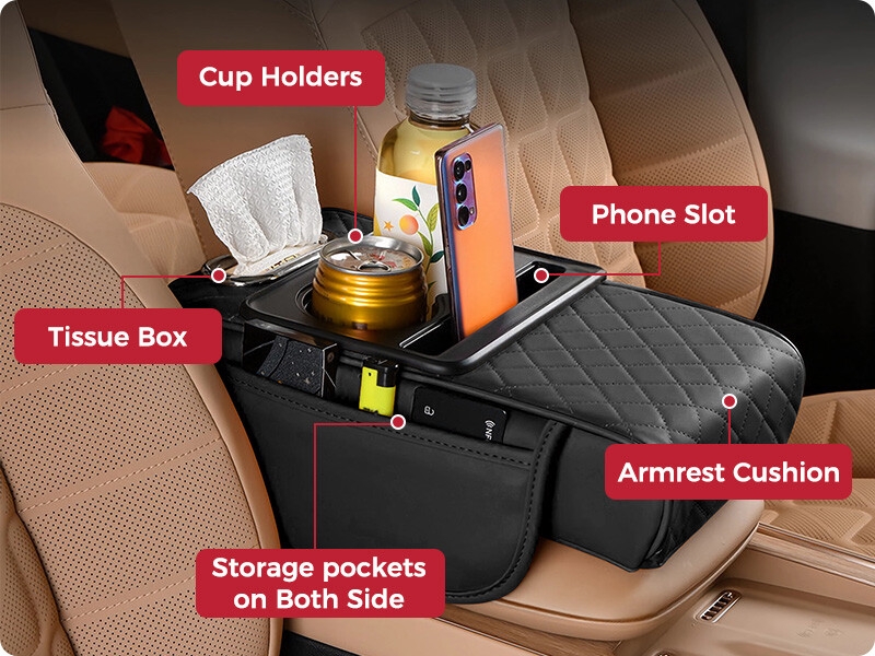 Featuring 2 cup holders suitable for drinks, 1 mobilephone slot, 1 tissue box, and 2 side pockets for storing keys, coins, credit cards, and other small items, along with a supportive armrest cushion.