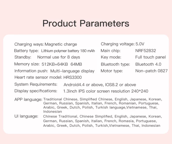 Key FeaturesFEATURESSleep monitoringBluetooth music controlCall reminder/message pushSports assistantIntelligent assistant and reminderHealth management