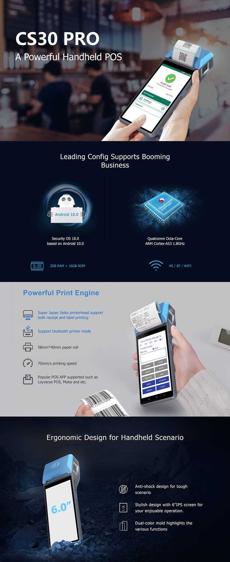 CS30 PRO Powerful Handheld Android POS with Label Printer Feature