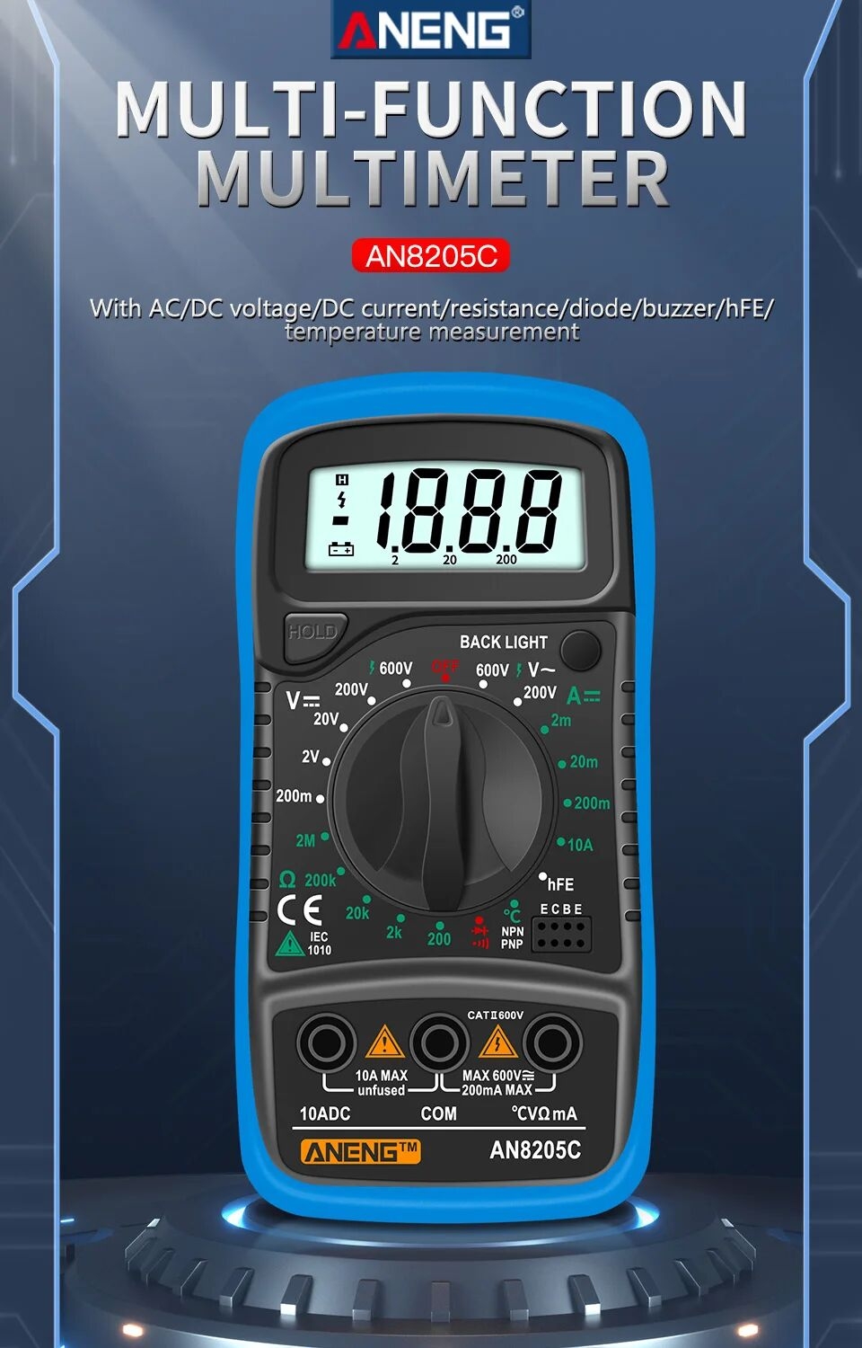 Digital Multimeter Voltmeter Battery Voltage Multi Tester-DC AC Voltmeter Measures Description: 4A practical electric multimeter tester gives accurate measurements for AC/DC Voltage, DC Current, Resistance, Continuity, Diodes, Transistor P-N junction & HFE(DC Amplification) test and more. Works as a Voltmeter, Ammter, OHM meter, Battery tester, Voltage tester This digital multimeter is fully functional, high precision, easy to use, compact and lightweight, DC voltage, DC current, AC voltage, resistance, diode, transistor, a common tool for professional enthusiasts and computer enthusiasts. Features: 1. [Multi-function] This digital multimeter can test AC/DC voltage, DC current, resistance, range selection and diode measurement. Note: This instrument does not support AC current measurement! 2. 【Accurate Reading & Maximum Safety】Battery quality test, Data retention function probes. Circuit Overload Protection on all ranges. The fuse can protect the multimeter effectively. Very useful for solving industrial and household electrical issues safely and accurately. 3. 【Data Hold】If you want to take measurements and record the results, just press the 'Hold' button, then the reading showed on the screen will be locked. 4. 【Portable and compact design】This digital multimeter is fully functional, accurate, easy to use, small and light, one-handed operation, and convenient measurement. It is an ideal multi-functional instrument for professionals, factories, schools, hobbyists or families. 5. 【LCD backlight】This instrument is a portable professional measuring instrument equipped with a digital LCD display and backlight for easy reading by users. Specifications: Name: Digital Multimeter Color: Blue-Black Material: ABS Size: 145x70x34mm Weight: 0.2kg Power: 9V battery (excluding battery) Measurement function: battery, resistance, DC, AC Protection tube: F 500mA/250V Power: 9V NEDA1604 or 6F22 battery (not included) Display: LCD, 1999, updated 2-3/ect. Measuring method: Dual slope full A/D converter Overflow indication: Only the number "1" is displayed on the display Polarity display: "-" indicates negative polarity Operating temperature: 0~40℃ Storage temperature: -10℃~50℃ DC voltage: 200mV-2-20-200-600V±0.5% AC voltage: 200V-600V±1.0% Continuous current: 200u-2m-20m-200m-10A±1.8% Resistance: 200-2kΩ-20kΩ-200kΩ-2MΩ±1.0% User Guide: 1. When measuring DC voltage dcv, AC voltage acv, shunt current, resistance, diode and battery position, insert the red test pen into the "vΩma" . Insert the black pen into the “com”. 2. When the DC current exceeds 200mA, insert the red test lead into the black test lead "10ADC" and then into the "COM" . The function switch sets the response range. Package includes: 1 * Digital multimeter (without battery) 2 * Test leads 1 * User manual