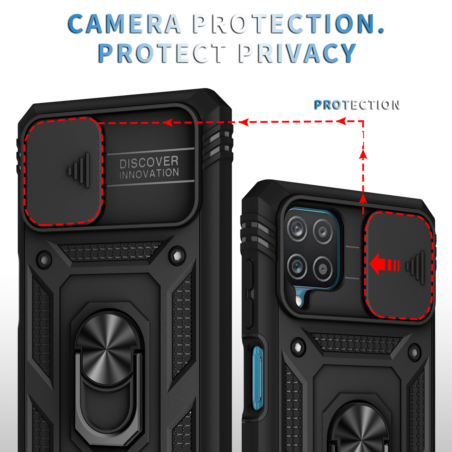 Dual Layer Military Grade Protective Cover with Slide Lens Protection + 360° Rotate Ring Stand for Samsung Galaxy A12; Shockpoof, Anti Slip, Drop Protection