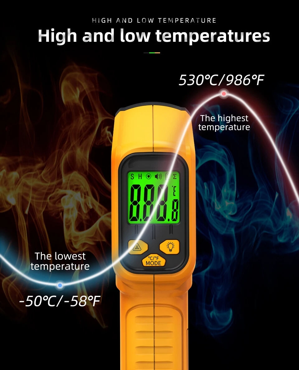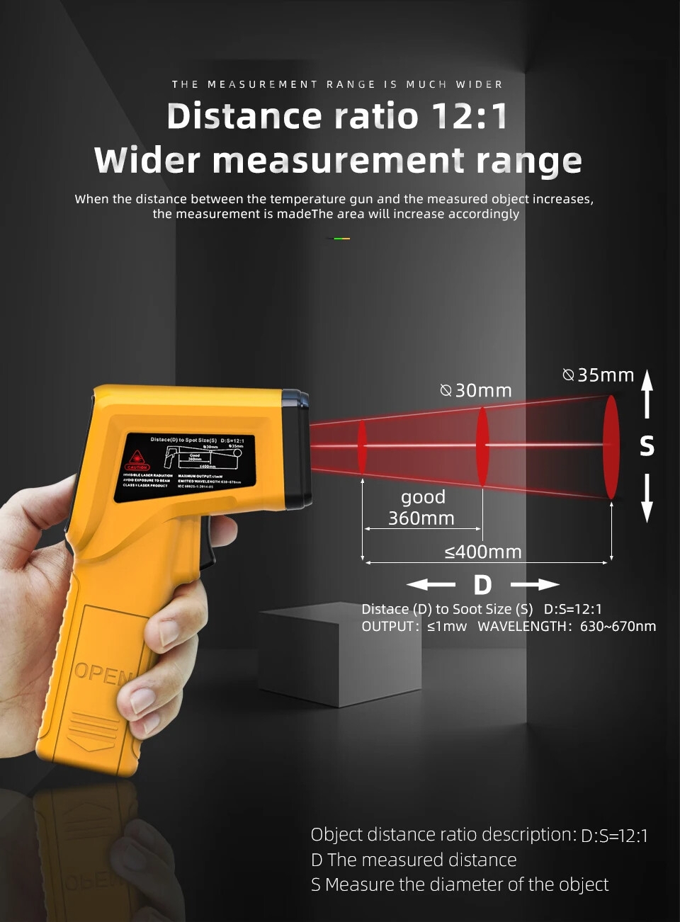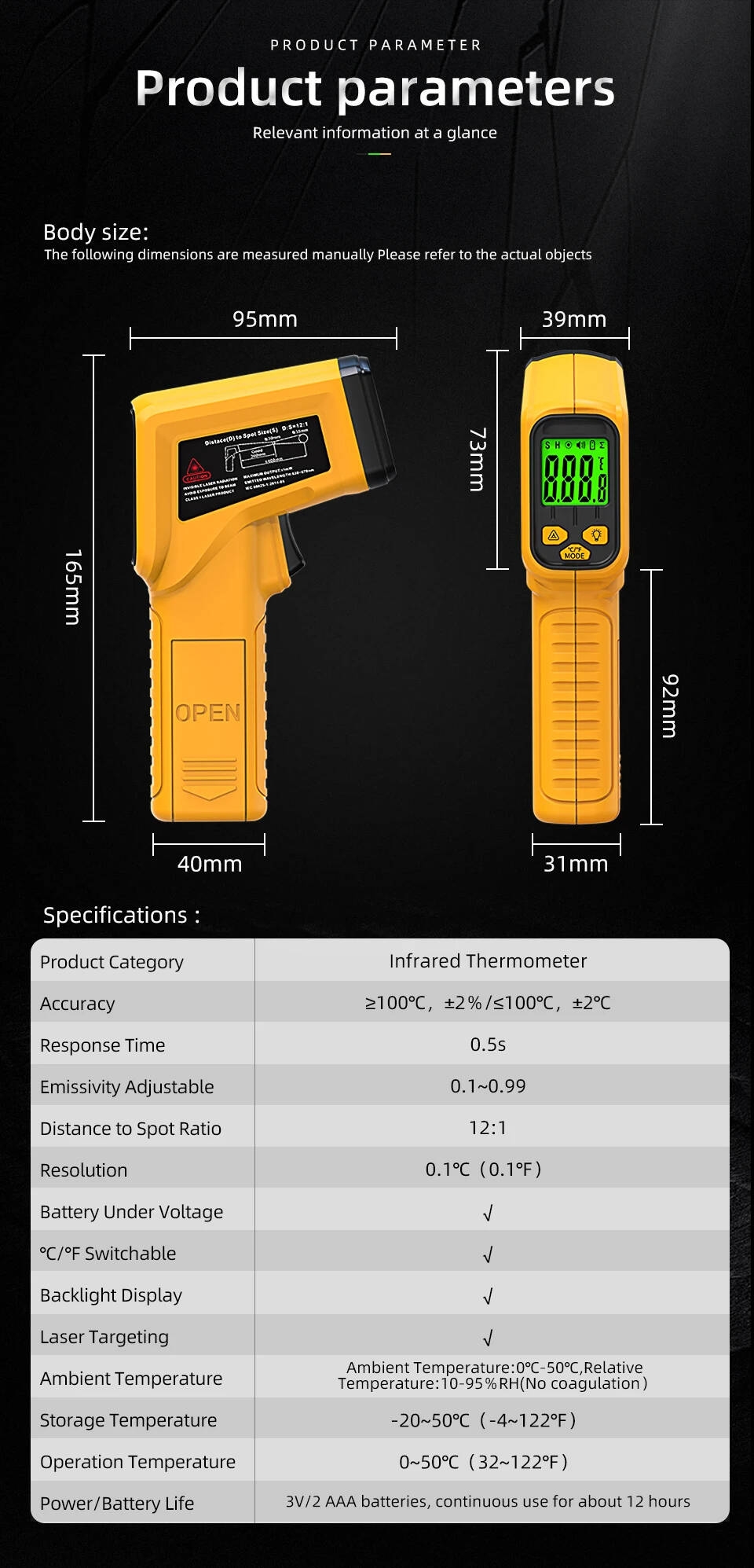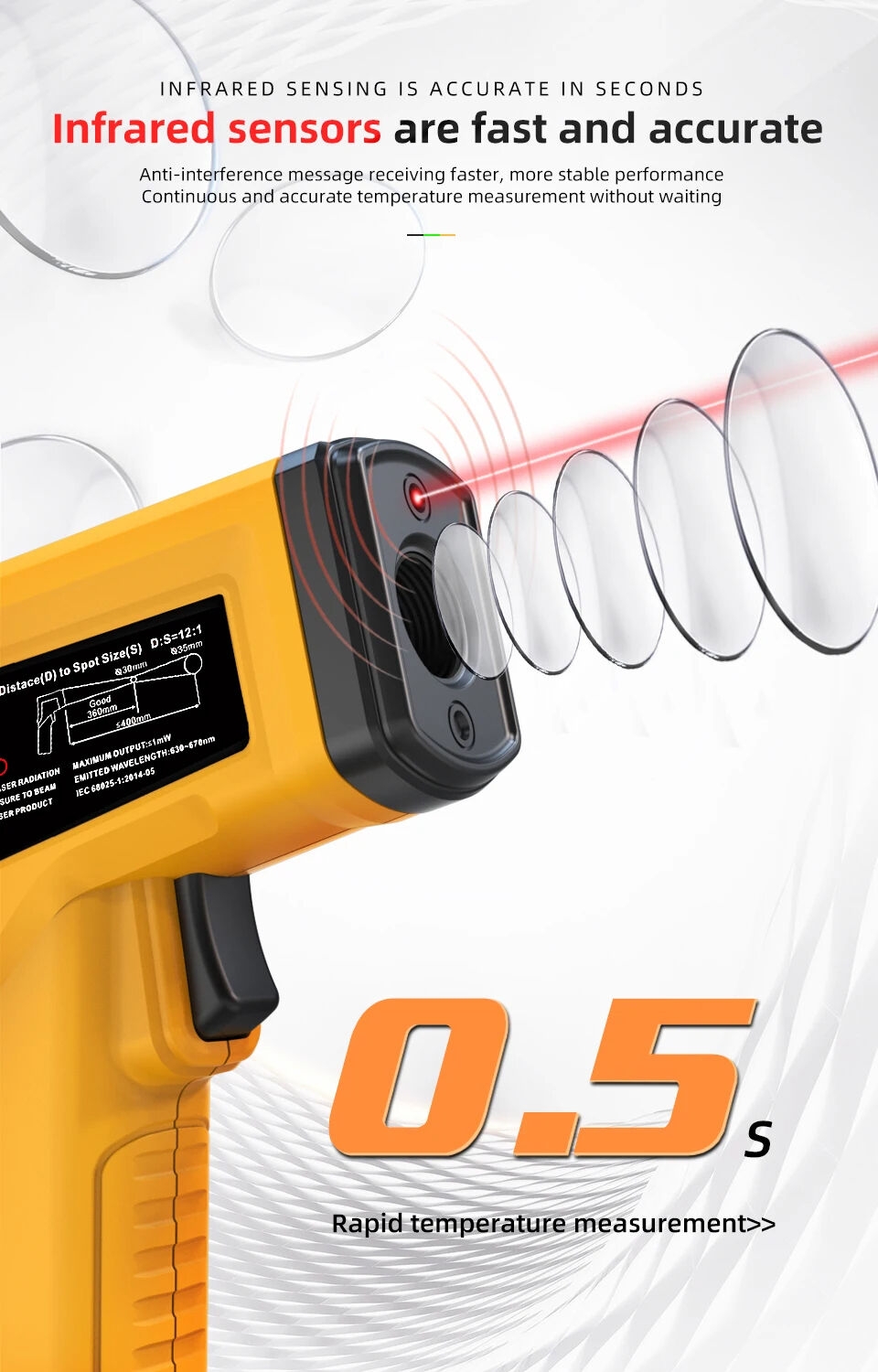 High Sensitivity: This thermometer is equipped with a high-sensitivity temperature sensor, capable of measuring temperatures from -50℃ to 530℃ within 0.5 seconds, with a measurement error of no more than ±1.5%. Its point-to-point ratio is 12:1, achieving more accurate measurements at the same distance, suitable for fast-paced, high-demand work environments.
