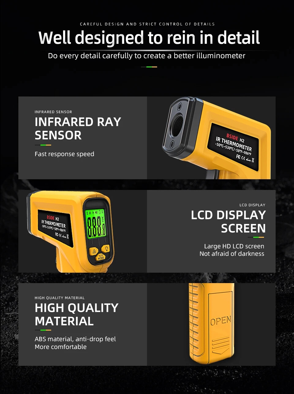 【Higher Precision】: With a distance-to-point ratio of 50:1, the H3 laser pointer can measure targets at greater distances more accurately than most other infrared thermometers.