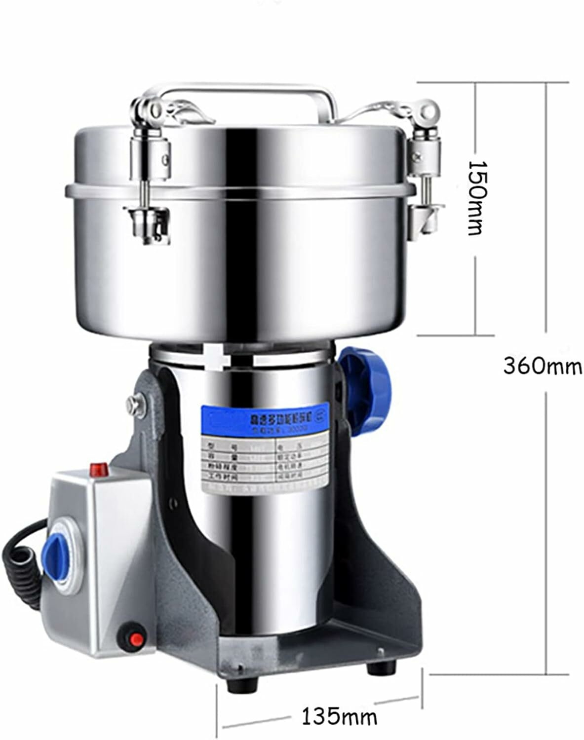 The Electric Grain Mill Grinder is made of 304 food-grade stainless steel to ensure food safety and easy to clean. The cover of the electric grain mill is equipped with a safety induction switch. When the cover is opened while the machine is working, the grain mill will automatically power off and stop working to ensure safety in use. The spice grinder is equipped with an upgraded overload protector. When the grinder is overloaded, the machine will automatically power off and stop working to prevent the motor from burning out in the overload/overheating condition. After the machine cools down, press the overload protection switch for the grinder to continue working. This electric grinder is suitable for various dry/dehydrated materials such as coffee beans, soybeans, rice, corn, wheat, pepper, cumin, dried peppers, animal feed and herbs, etc. (NOTE: Not suitable for wet, fresh, oily or sticky materials.).Various dry materials can be quickly crushed in 30 seconds-3 minutes, it is recommended that the continuous working time should not exceed 3 minutes to avoid problems such as machine overload. After grinding, please clean the remaining powder inside the jar with a cleaning brush and then wipe the inside of the jar with a dry cloth. (The grinding jar is not removable, so do not use water to clean or rinse the motor base directly to avoid damage to the motor).