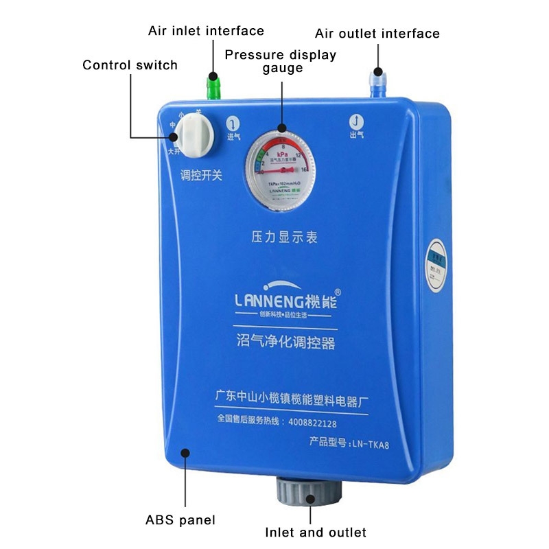 Biogas desulfurizer with inbuilt gauge, this Biogas Desulfurizer is used to purify biogas before use. Biogas contains sulfur and moisture. Through the purification regulator, sulfur can be removed (sulfur is very corrosive to biogas stoves), and the regulator can also adjust the flow of biogas. Let the water in the pipe block the pipe