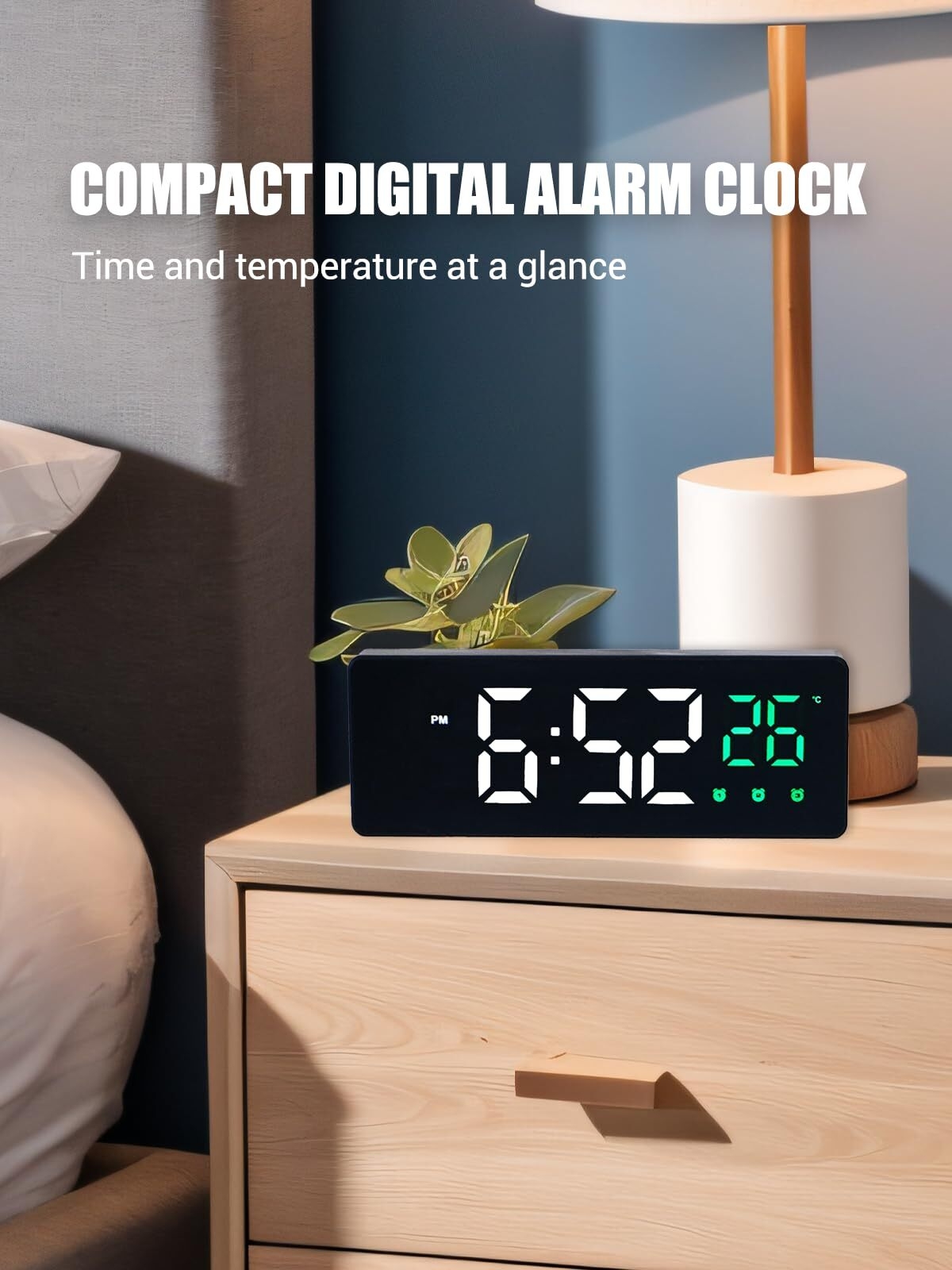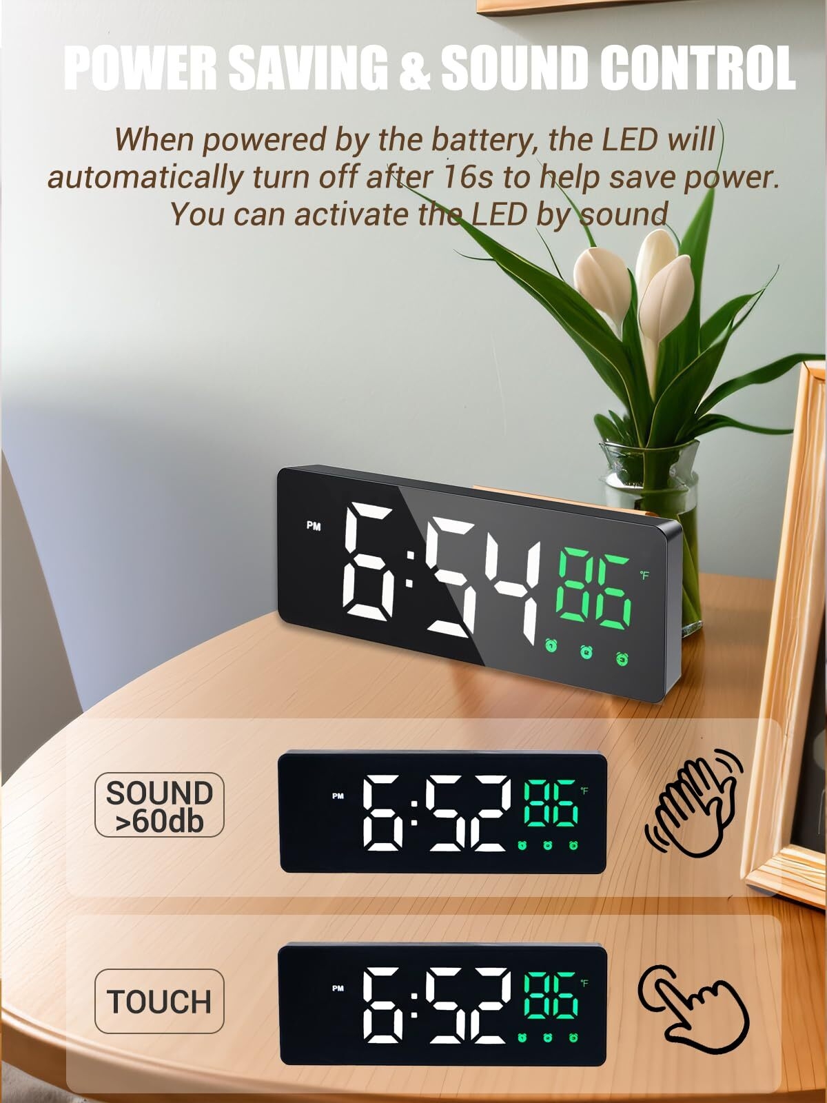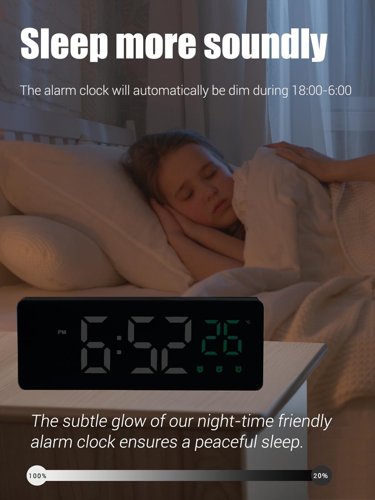 Never struggle with just one alarm again. Our triple alarm system ensures you’re always on time. If you prefer a dark environment for sleeping, the voice control mode is a game-changer; the screen only lights up when you need it.