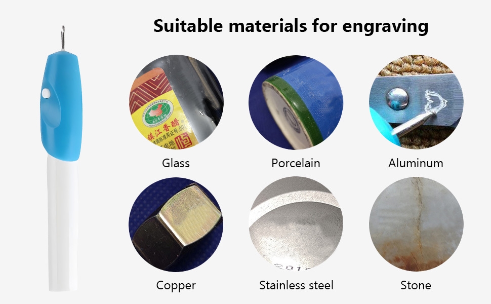 The engraving pen features a sleek and ergonomic design, with a comfortable grip that allows for extended use without fatigue. The blue and white color scheme adds a modern touch. Its lightweight construction makes it easy to maneuver, whether you’re etching on glass, wood, metal, or plastic.