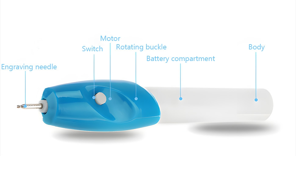 The engraving pen features a sleek and ergonomic design, with a comfortable grip that allows for extended use without fatigue. The blue and white color scheme adds a modern touch. Its lightweight construction makes it easy to maneuver, whether you’re etching on glass, wood, metal, or plastic.