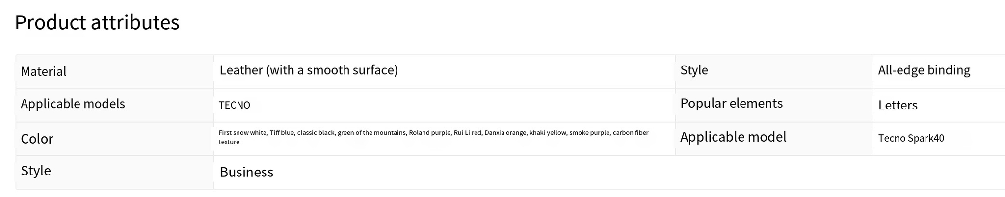 Key FeaturesMaterial: Vegan LeatherStyle: Full Edge CoverageApplicable Models: TECNO (Tecno Spark40)Trendy Element: LettersColor: BlackDesign Style: Business