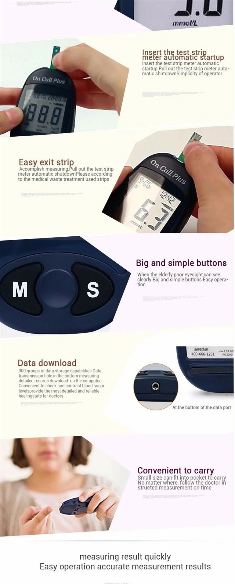 Usability: Supports alternate site testing (fingertip, forearm, palm), auto-detects insufficient sample, optional individually wrapped strips, PC connectivity available