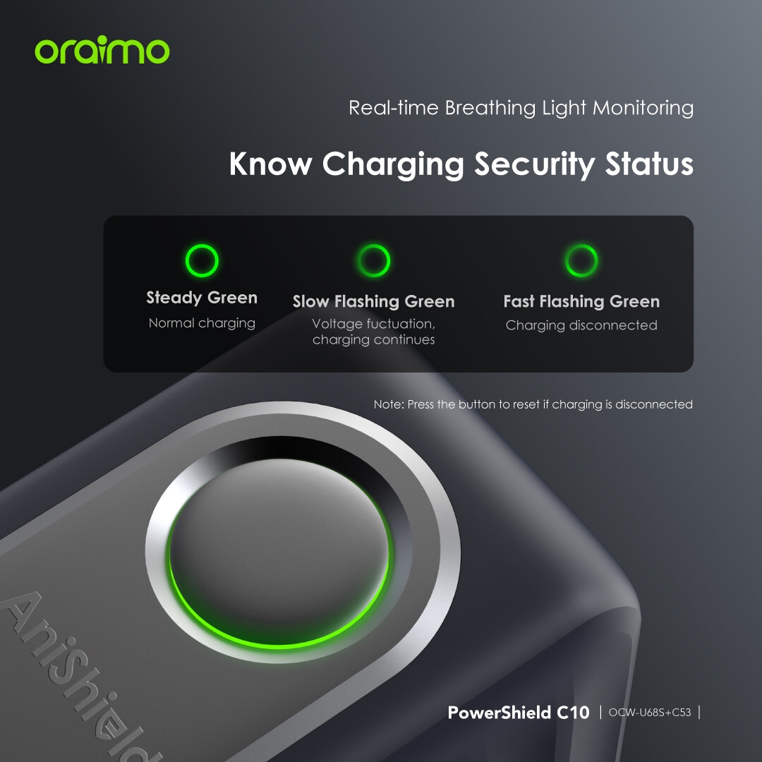 Equipped with oraimo's exclusive smart-charging protection technology——AniShield™. It identifies voltage situation of your devices and actively filters any potential dangers in real time. When the voltage fluctuation exceeds the maximum input of the charger, the charger will automatically disconnect the charging.