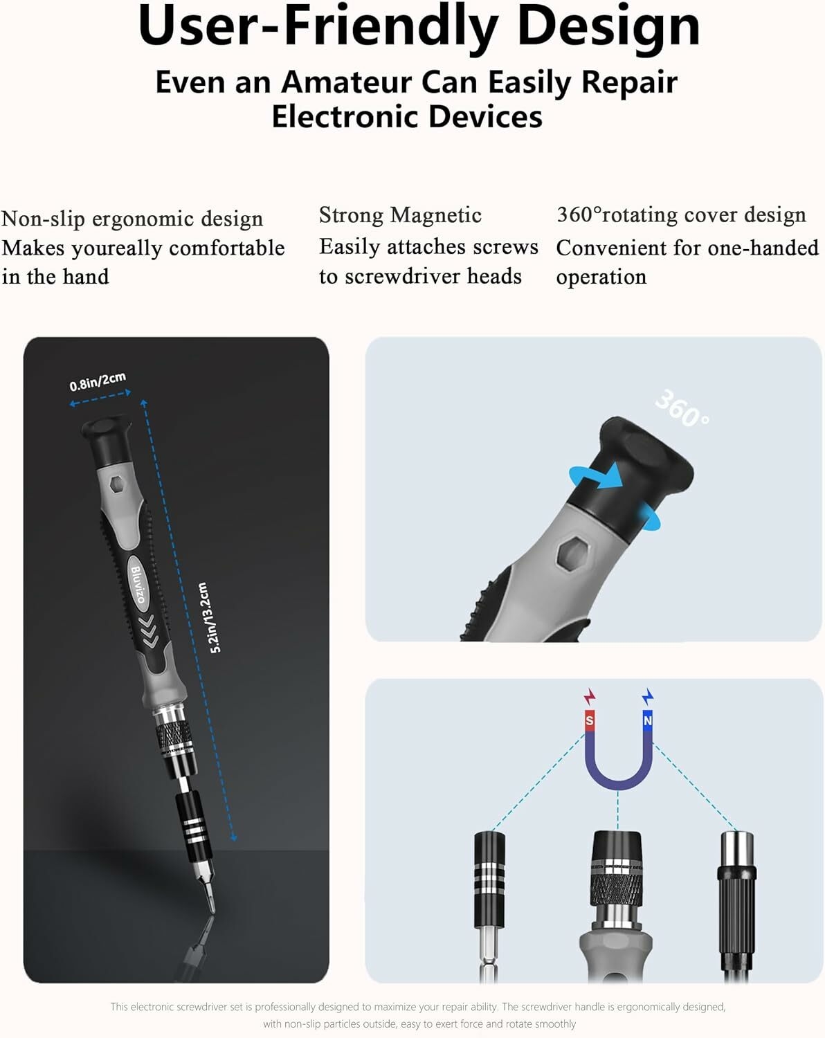 Magnetic Screwdriver Set: The screwdriver heads are magnetic, Made of impact-resistant tool steels, solid as chrome vanadium steel, and they can tighten the screws during repair, which improves performance and saves your time and effort.