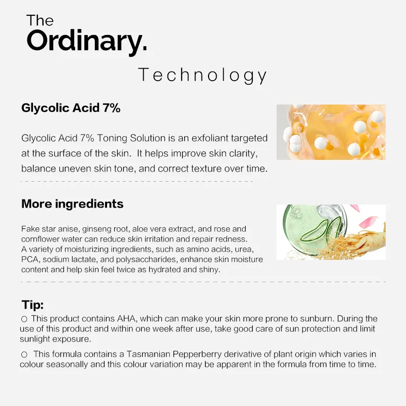 Glycolic Acid 7% Toning Solution significantly smoothes skin texture and promotes the appearance of a more even skin tone, as well as more luminous skin, with regular use. It also reduces the appearance of lines and wrinkles. The water-based toner format is suited to daily use. It contains a 7% concentration of Glycolic acid - a well-studied alpha-hydroxy acid - and a plant-derived Tasmanian Pepperberry derivative, which varies seasonally, and which may cause an apparent variation in the formula from time to time. This formula should not be used on sensitive, peeling or compromised skin. Please refer to the additional sun protection notes and other warnings in the provided directions. This pH of this formula is approximately 3.6. Glycolic Acid has a pKa of 3.6 and pKa is the most important aspect to consider in formulating with acids. pKa describes the acidity of a molecule. When pKa is close to pH, there is an ideal balance between salt and acidity, maximizing effectiveness of the acid and reducing irritation. The Ordinary Tip: The multi-functional formula can also be applied to the scalp, where it helps rebalance and reduces dryness by hydrating the scalp skin.