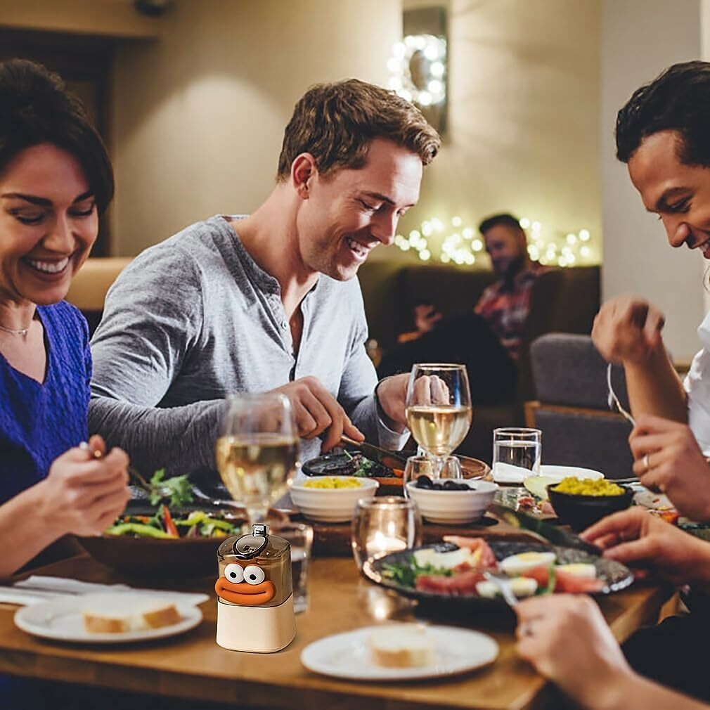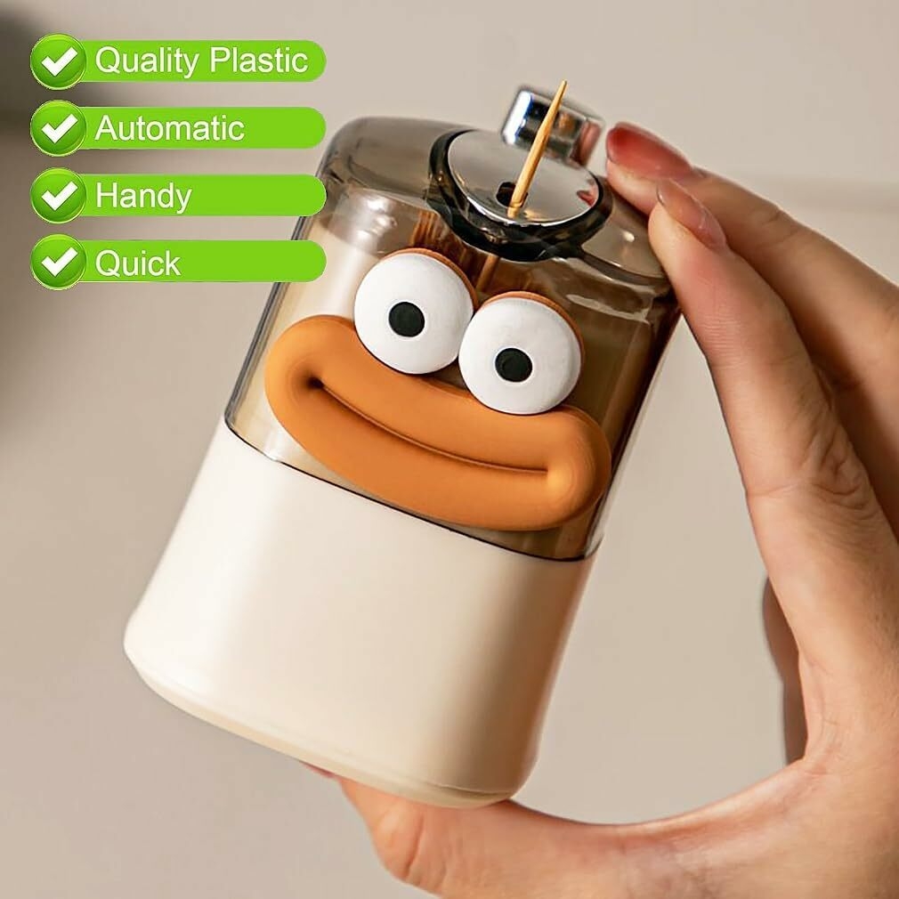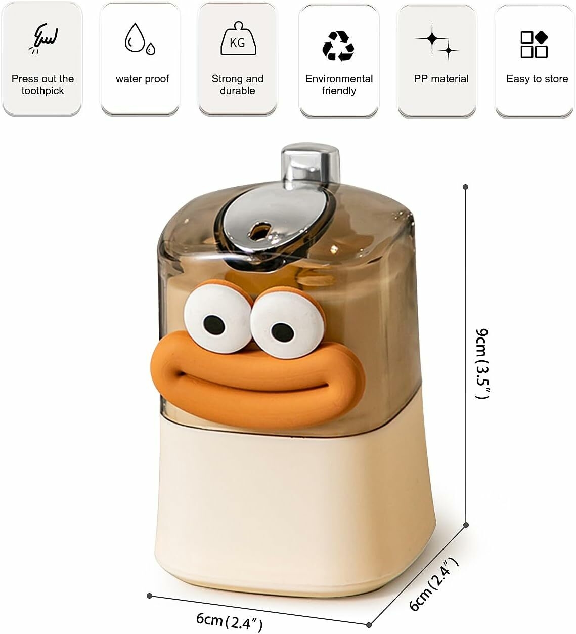 Key FeaturesCUTE ANIMAL DESIGN: Adorable duck/bird face design with large googly eyes and orange beak, made in kawaii style with transparent top and white baseSMART MECHANISM: Press the top button to automatically dispense one toothpick at a time, keeping things hygienic and convenientUNIQUE BUILD: Features a clear dome top to see toothpick level, combined with a sturdy white plastic base for stabilityTWO-PART DESIGN: Consists of a transparent upper section for visibility and white bottom section for storage, making refills easy to manageDESKTOP FRIENDLY: Compact and stable design makes it perfect for tables at home, office, or restaurants while adding a cheerful decorative touch.