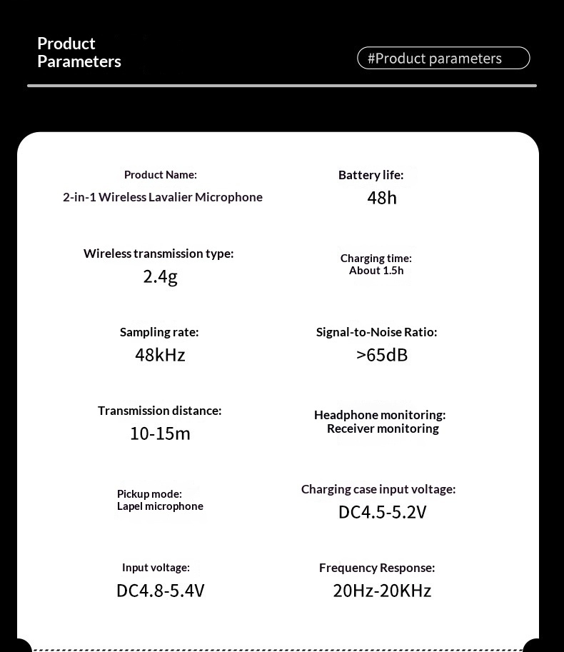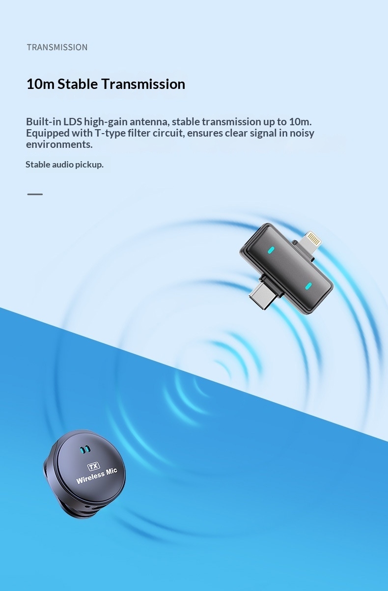 Transmission distance: recording (actual measurement): 33 meters without obstacles, 25 meters when facing away; playback (actual measurement): 35 meters without obstacles, 27 meters when facing away
