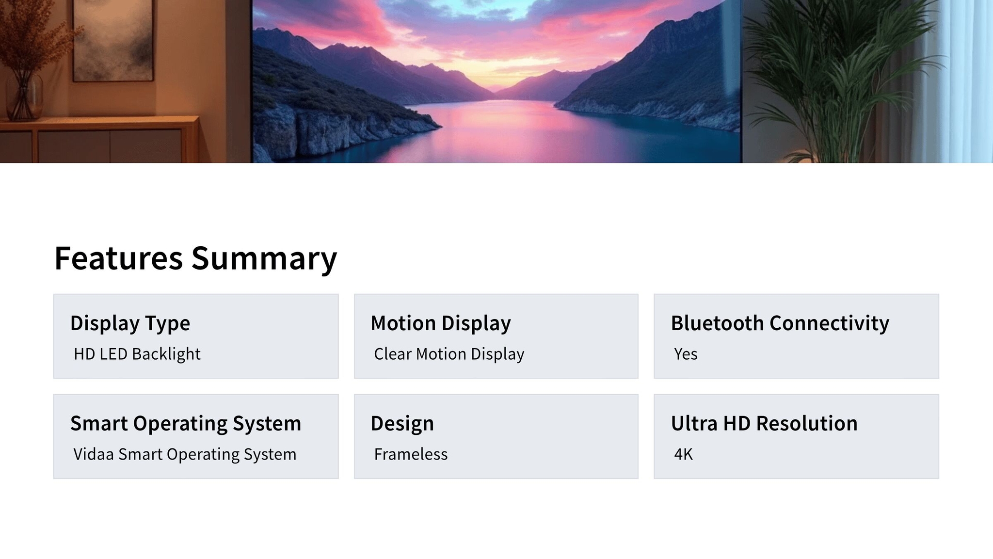 Key FeaturesDisplay Type: HD LED BacklightClear Motion Display65 InchBluetooth ConnectivityVidaa Smart Operating SystemLED FramelessUltra HD - 4K Resolution