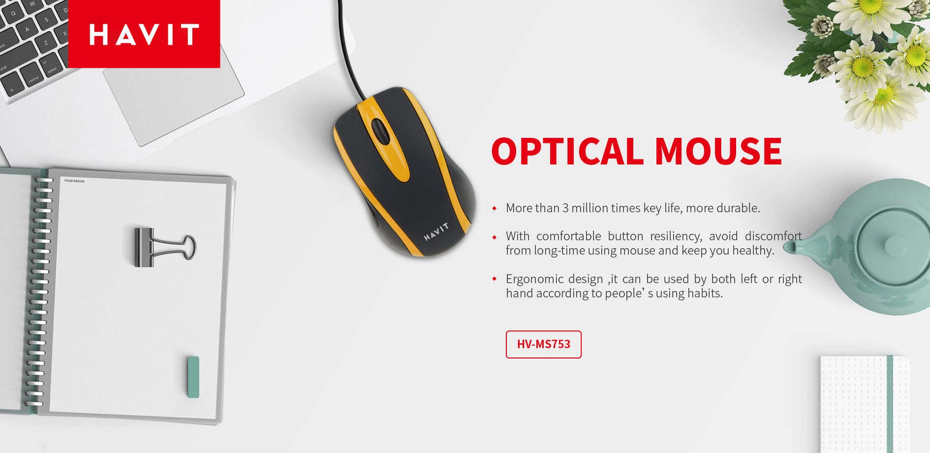 Key FeaturesCategorySpecificationModelHV-MS753Key LifeMore than 3 million timesProduct HighlightsHIGH DURABILITY: More than 3 million clicks for long-lasting reliability.COMFORTABLE CLICKS: Optimized button resiliency prevents discomfort during extended use.ERGONOMIC AMBIDEXTROUS DESIGN: Suitable for both left and right-handed users.OPTICAL GAMING SENSOR: Delivers precise tracking and responsive performance.HEALTH-FOCUSED DESIGN: Aims to reduce strain and keep you comfortable during long sessions.