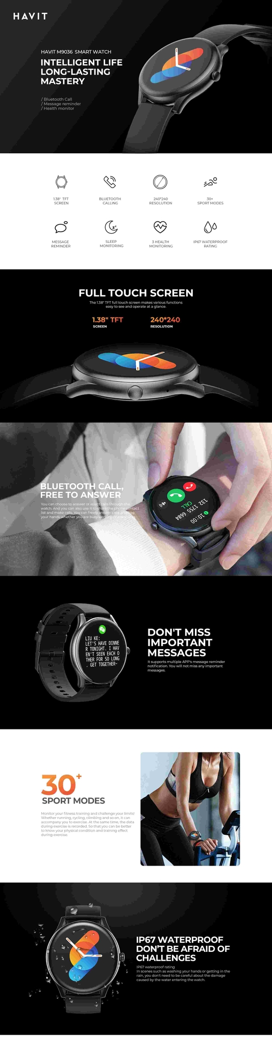 Key FeaturesKey FeaturesIntelligent life long-lasting battery.Bluetooth call.Message reminder.Health monitor.240*240 Resolution.1.38″ TFT screen.IP67 waterproof rating.Battery capacity: 220mAh.