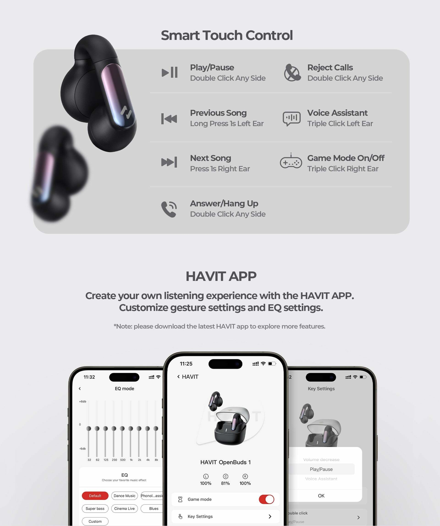 Key FeaturesControl app with over 13 features7 Sound Frequency Modes (Default, Rock, Jazz, Dance, Classical, BlueMulti-point connectionBluetooth 5.3 connectionVoice AssistantGaming Mode