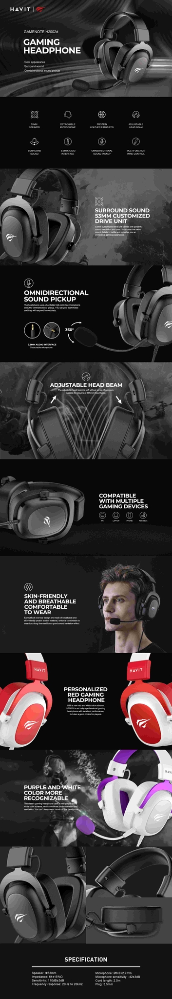Key Features53MM CUSTOMIZED DRIVE UNIT: Delivers powerful sound resolution and deep bass for an immersive gaming experience.DETACHABLE MICROPHONE: Offers flexible use and easy storage when not needed.OMNIDIRECTIONAL SOUND PICKUP: Features a bendable high-definition microphone with 360° pickup for clear team communication.ADJUSTABLE HEAD BEAM: Soft, pressure-free design fits players with different head types comfortably.MULTI-DEVICE COMPATIBILITY: Works with PC, laptop, phone, and PS4/XBOX via a 3.5mm audio interface.COMFORTABLE PROTEIN LEATHER EARMUFFS: Breathable, over-ear design provides long-wearing comfort and good sound insulation.STYLISH COLOR SCHEMES: Available in bold red/white or classic purple/white designs that combine professionalism and aesthetics.