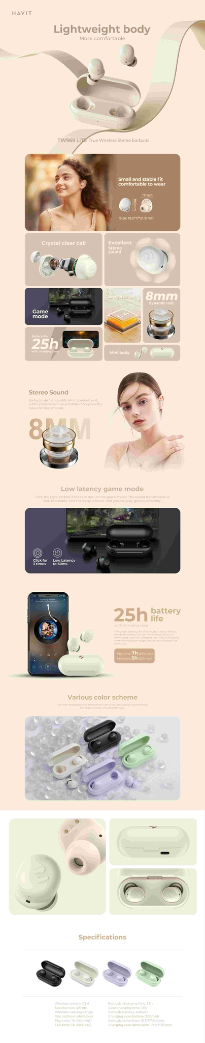 Key FeaturesLIGHTWEIGHT DESIGN: Mini body and small, stable fit for all-day comfort.8MM DYNAMIC DRIVERS: Delivers rich vocal details, powerful bass, and clear treble.LOW-LATENCY GAME MODE: Reduces audio delay to as low as 60ms for smooth gameplay.LONG BATTERY LIFE: Up to 7 hours of playtime per earbud and 25 hours total with the charging case.CRYSTAL CLEAR CALLS: Built-in microphones ensure excellent call quality.LATEST WIRELESS TECH: Features Bluetooth 5.4 for a stable connection up to 10 meters.STYLISH COLOR SCHEMES: Charging case comes in lovely, low-saturation color options.