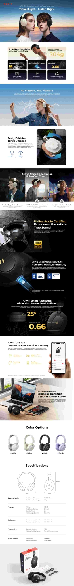 Key FeaturesACTIVE NOISE CANCELLATION: Blocks ambient noise for immersive listening in transit, at work, or on walks.80-HOUR BATTERY LIFE: Extended playback with ANC off, and a 5-minute quick charge provides 5 hours of playtime.ULTRA-LIGHT & FOLDABLE: Weighs only 204g with a U-shaped headband and foldable design for portability and comfort.HAVIT LIFE APP: Customize your sound with 6 EQ presets, control ANC modes, and enable low-latency gaming mode.MULTI-POINT CONNECTIVITY: Pair with two devices simultaneously for seamless switching between phone, tablet, or computer.SMART AESTHETICS: Features a minimalist, faceted cover design inspired by the golden ratio for a refined look.